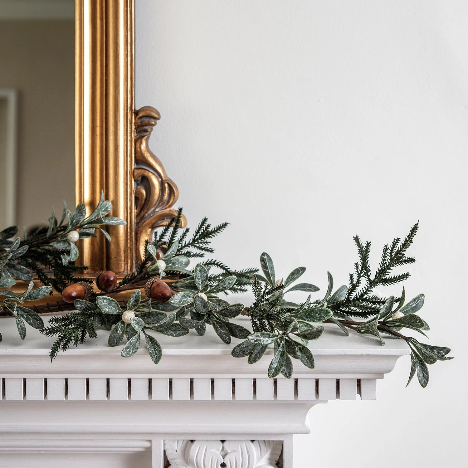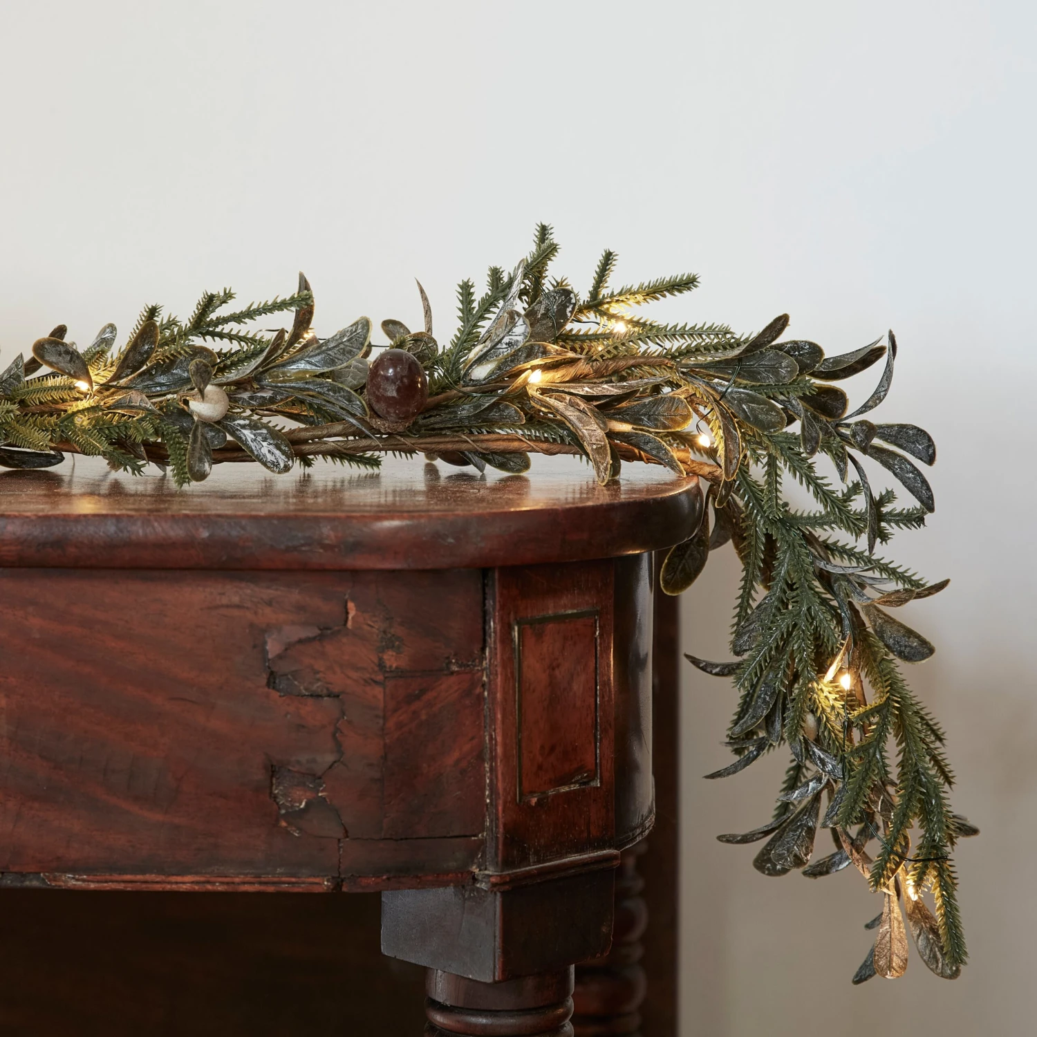 Diese Girlande bringt garantiert Weihnachtsstimmung in dein Zuhause! Mit gefrostetem Winterlaub, Mistelzweigen und Tanne, verziert mit künstlichen Eicheln und glitzernden Beeren ist sie ein absoluter Hingucker. Mit einer Länge von 1,8 m eignet sich diese Girlande perfekt zum Dekorieren von Kaminsimsen, Fensterbänken oder sogar als ein moderner Tafelaufsatz. Sie ist bereits mit einer Micro Lichterkette umwickelt. Lege einfach 3 x AA-Batterien in das Batteriefach ein und verwende den praktischen 6-Stunden-Timer, um sie abends zauberhaft funkeln zu lassen.