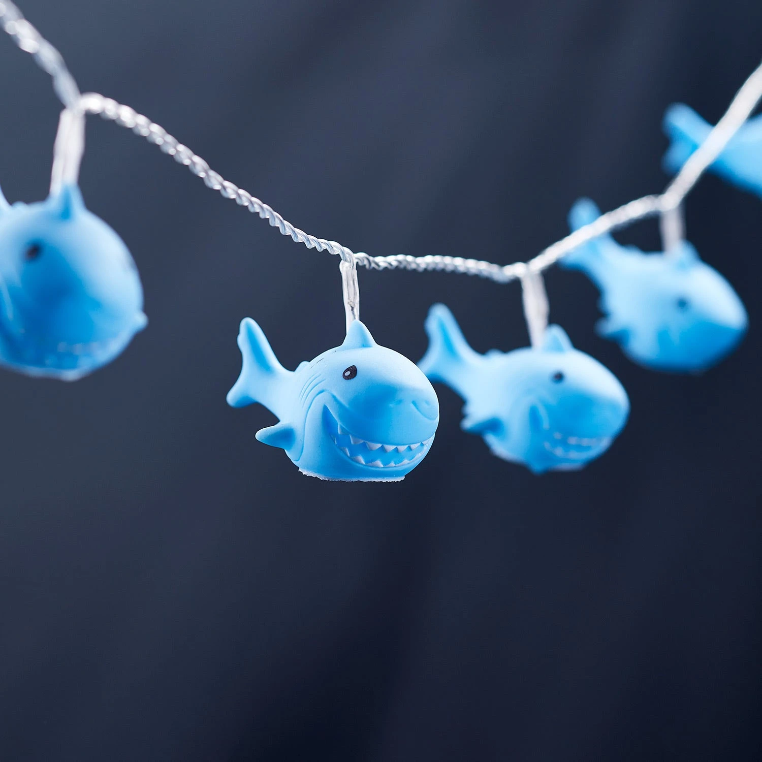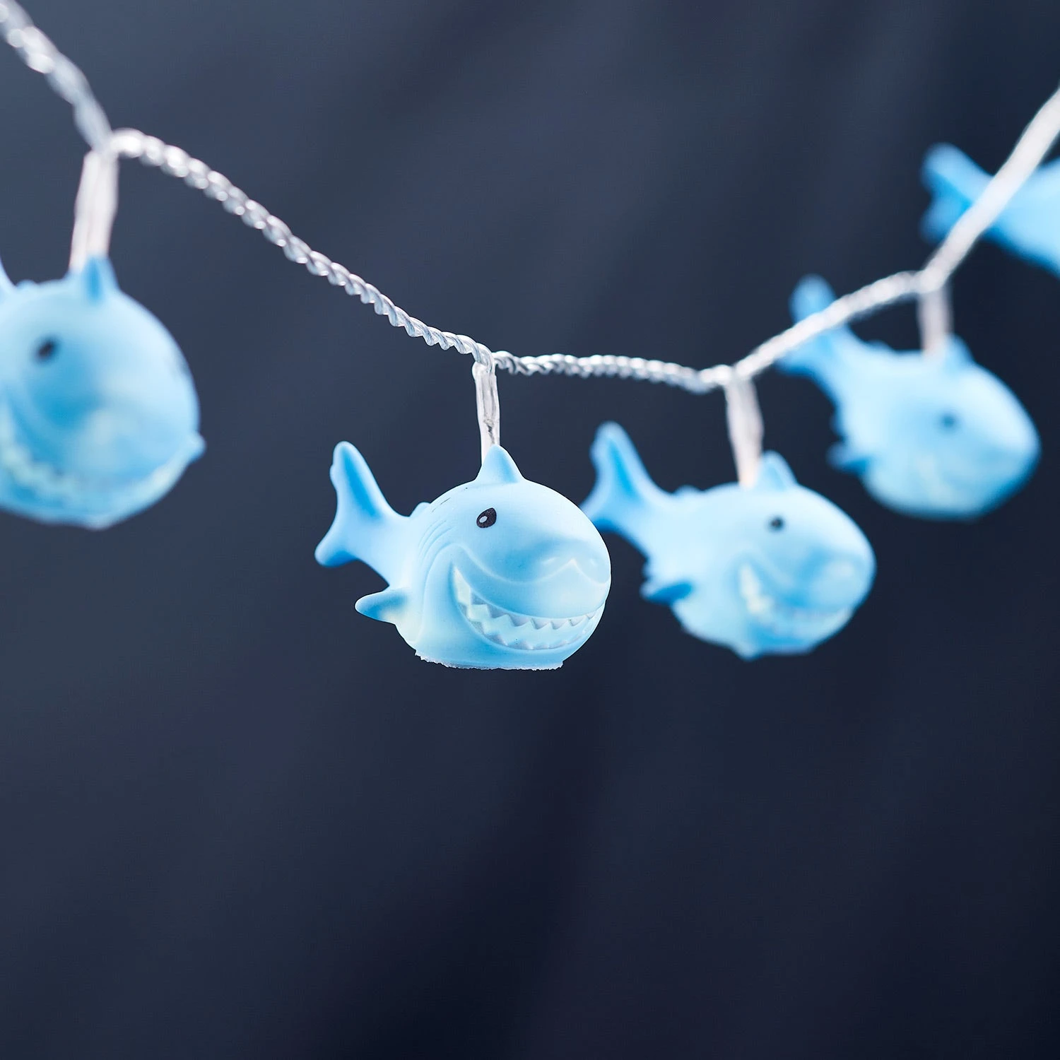 Diese geniale Lichterkette passt wunderbar in das Zimmer kleiner Meeresliebhaber und Hai-Fans. 10 blaue Haie mit freundlichen Gesichtern verteilen sich gleichmäßig auf 1,35m Kabel und beherbergen jeweils eine warmweiße LED. Sie verleihen dem Kinderzimmer ein Unterwasser-Feeling und lassen sich ganz einfach an Bettrahmen oder Regalen drapieren. Lege einfach Batterien ein und schalte den 6-Stunden-Timer ein, damit die Haie am Abend zum Leben erweckt werden! Du kannst mit bis zu 120 Stunden Leuchtdauer rechnen, bevor die Batterien ausgetauscht werden müssen.