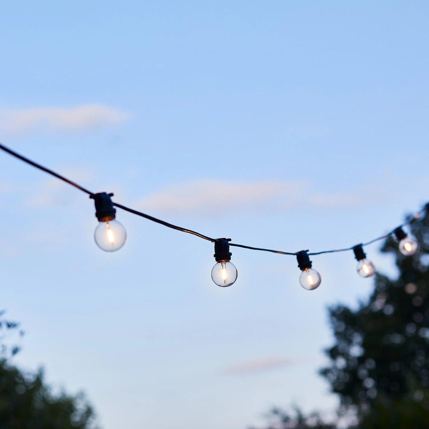 Sorge für stilvollen Glanz in deinem Außenbereich! Auf dieser trendigen 9,5m langen Party Lichterkette verteilen sich in gleichmäßigen Abständen insgesamt 20 Glühbirnen aus Glas. Ob für Gartenpartys oder eine Hochzeit im Freien, dank der 5m langen Zuleitung hast du genügend Freiraum beim Anbringen der Lichter und die warmweißen LEDs sorgen für eine angenehme Beleuchtung am Abend.