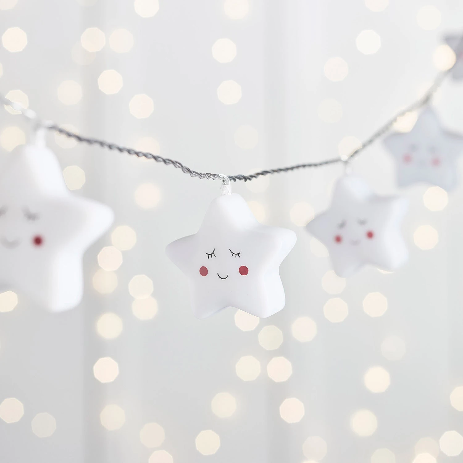 Diese kleinen LED Sterne mit niedlichen lächelnden Gesichtern und rosa Wangen lassen im Kinderzimmer einen leuchtenden Nachthimmel entstehen. Befestige die Sternlichterkette zum Beispiel an der Wand oder am Bettrahmen. Die 20 Sterne sind gleichmäßig auf einem durchsichtigen Kabel verteilt und verbreiten ein sanftes, warmweißes Licht. Stecke zur Schlafenszeit einfach den Stecker in eine Steckdose und es entsteht eine wunderbar ruhige Atmosphäre.