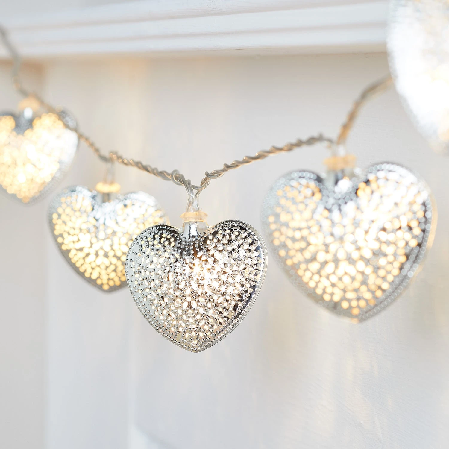 Diese Lichterkette mit sanft leuchtenden silbernen Herzen ist ein dekoratives Accessoire fürs Schlaf- oder Wohnzimmer. Befestige sie zum Beispiel an Regalen oder am Kopfteil des Bettes – die 3m lange Zuleitung zum Netzstecker gibt dir hier viel Freiraum. Die 20 Herzen aus Metall mit einem feinen Cut-Out-Design verteilen sich auf 2,85m transparentem Kabel und werden jeweils von einer warmweißen LED beleuchtet. Betätige nach dem Anschließen an den Strom einfach den Wippschalter oder verwende den optionalen Timer, damit die Lichterkette jeden Tag um dieselbe Uhrzeit für 6 Stunden zu leuchten beginnt.
