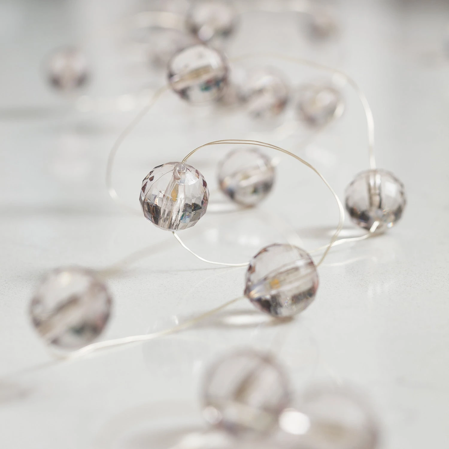 Unsere einzigartige Micro Lichterkette mit Acrylperlen verleiht jedem Raum das gewisse Etwas. Die insgesamt 20 Perlen mit ihren warmweißen LEDs verteilen sich gleichmäßig auf einem 1,9m langen, flexiblen Silberdraht und glänzen besonders schön an deinen Regalen oder im Inneren einer unserer Deko-Glasglocken (separat erhältlich). Dank des praktischen 6-Stunden-Timers kannst du sicher sein, dass die Lichterkette jeden Abend zur gleichen Zeit erstrahlt. Lege einfach 3 x AA Batterien in die Batteriebox ein und bringe die Perlen zum Funkeln.