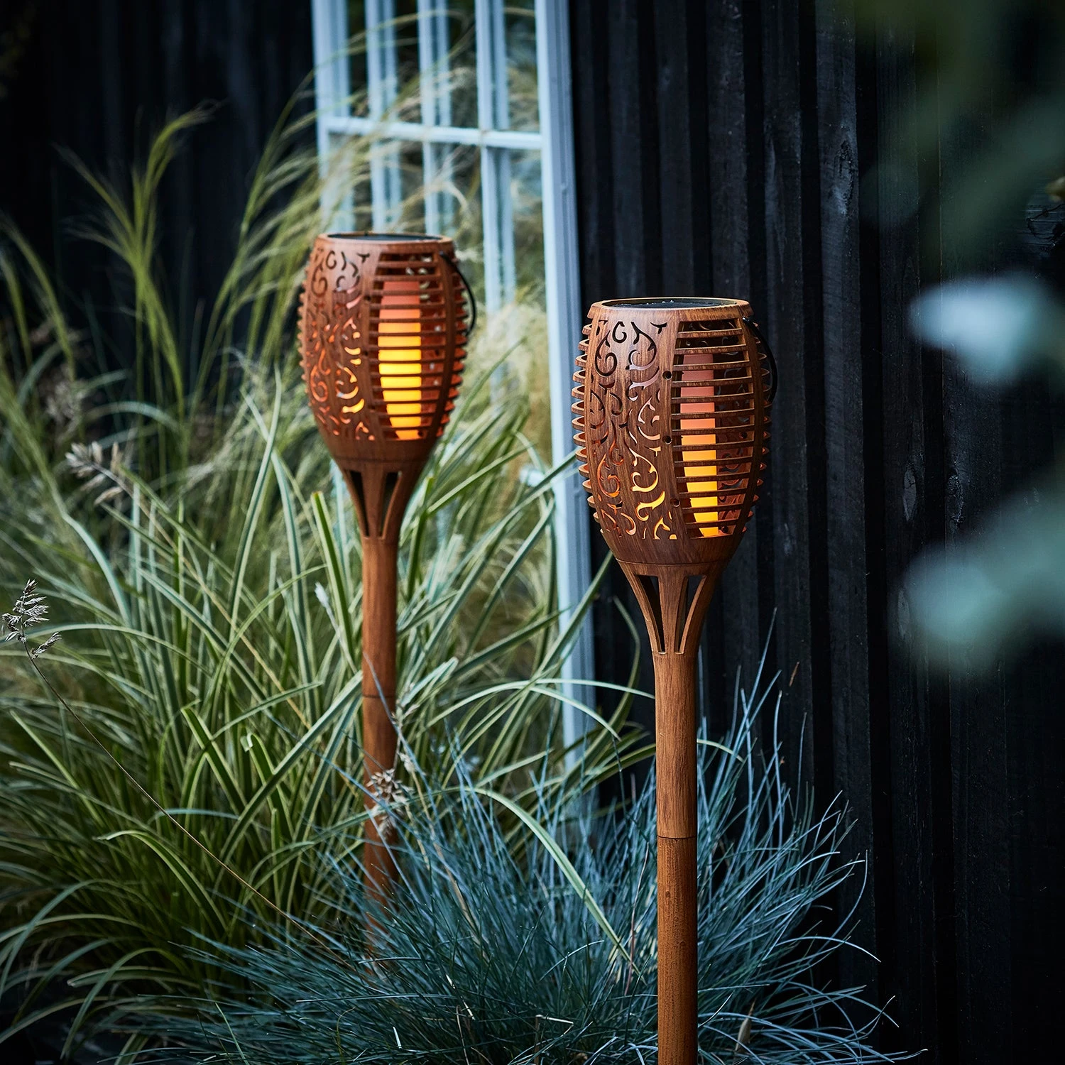 Mach deinen Garten zum einladenden Paradies mit diesen wetterbeständigen Tiki Solarfackeln aus Kunststoff mit Holz-Effekt. Das Duo mit Solarbetrieb ist ideal für deinen nächsten Grillabend oder eine Gartenparty mit exotischem Ambiente. Die warmweiße LED Flamme flackert leicht, was ihr den Anschein einer realistischen Fackel gibt. Stell das Tiki Solarfackel Duo tagsüber einfach in die direkte Sonne, damit sich die Batterien aufladen und bei voller Sonne bis zu 10 Stunden leuchten. Diese Solarfackeln sind kabellos, was ihre Platzierung in deinem Garten noch leichter und flexibler macht.