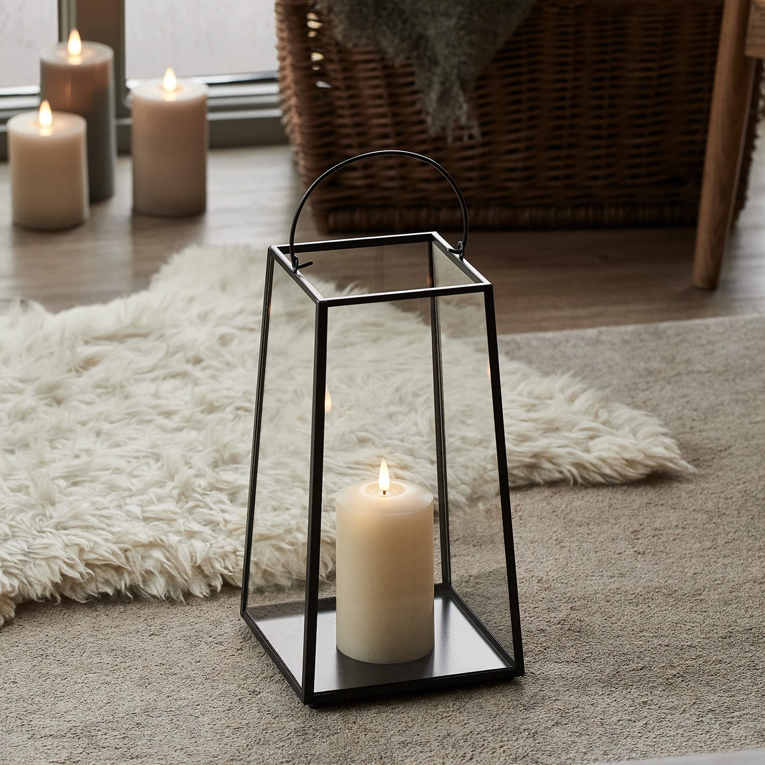 Kreiere ein modernes Dekoelement in deinem Garten mit unserer schwarzen LED Laterne mit einer TruGlow® Kerze! Unsere Laterne hat eine Höhe von 31cm, ein mattes Finish und klare Glasscheiben an den Seiten. Die LED Kerze im Inneren besteht aus Kunststoff und ist daher wasserfest und gegen die Elemente gesichert. Platziere die Laterne zum Beispiel im Eingangsbereich oder auf der Terrasse und kombiniere dazu die passende große Laterne – eine tolle Deko für das ganze Jahr! Lege einfach 2 x C Batterien in die Kerze ein und aktiviere den 6-Stunden-Timer, wenn sie jeden Abend automatisch zur gleichen Zeit erleuchten soll.