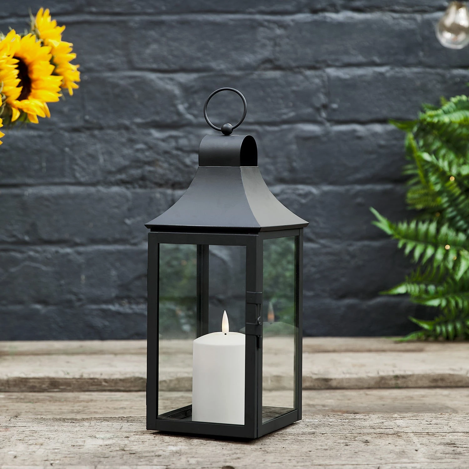 Versprühe eleganten Charme mit unserer schwarzen Gartenlaterne! Ganz egal, ob bei Tag oder Nacht – das klassische Design in Kombination mit unserer exklusiven TruGlow® Outdoor Kerze macht diese Laterne jederzeit zum echten Blickfang. Mit einer Höhe von 34cm kannst du sie entweder alleine aufstellen oder mit unseren anderen, unterschiedlich hohen Gartenlaternen (separat erhältlich) kombinieren, um ein stimmiges Gesamtbild zu erzeugen. Die flackernde LED-Flamme der Kerze wirkt absolut realistisch und taucht deinen Außenbereich am Abend in ein angenehm warmes Licht. Lege einfach 2 x C Batterien in den Boden der Kerze ein und verwende den 6-Stunden-Timer für ein automatisches Leuchten am Abend.