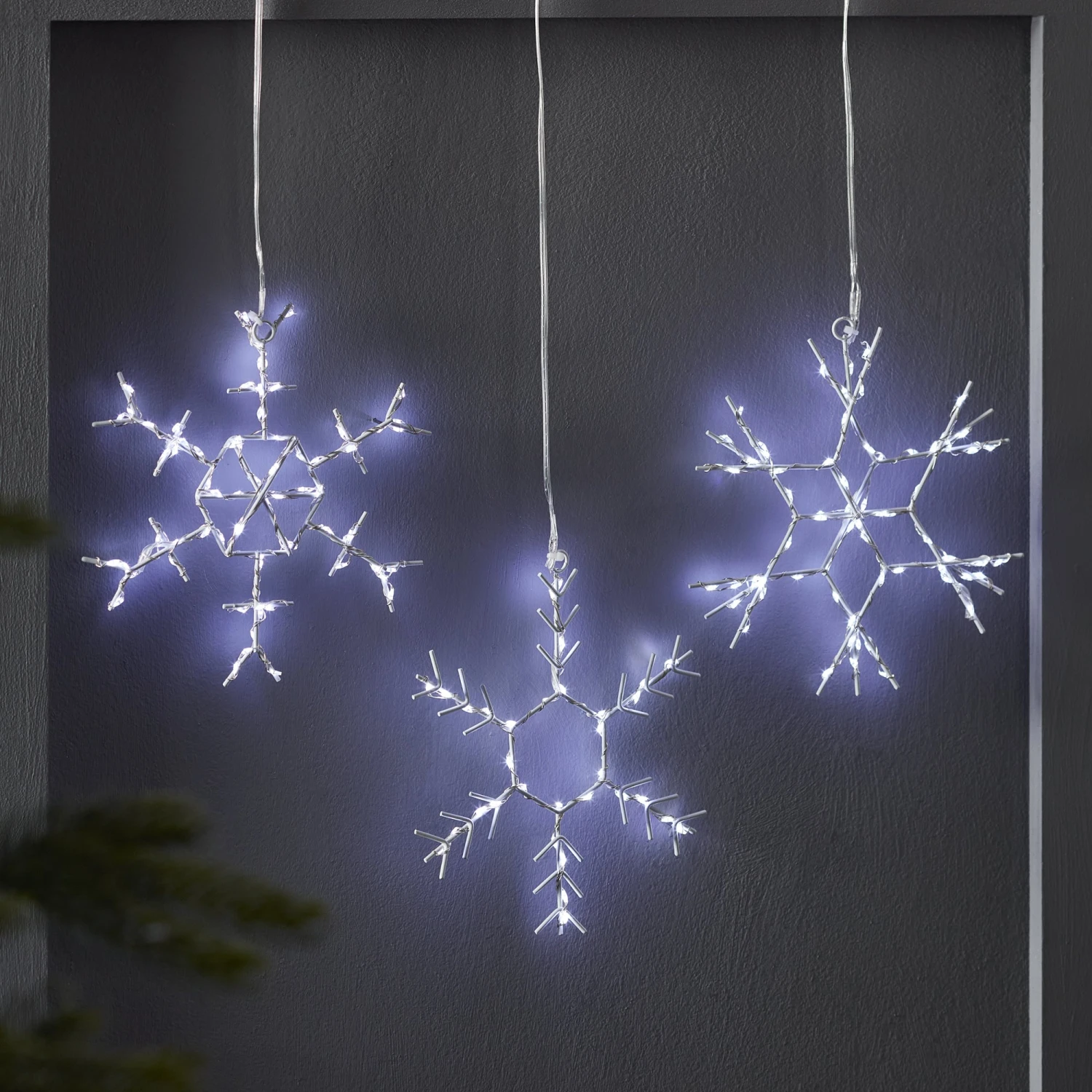 Bringe winterlichen Glanz in deine Räume! Unser Trio aus leuchtenden Schneeflocken ist eine wunderbare Fensterdeko zur Weihnachtszeit und verleiht deinem Weihnachtsbaum ein eisiges Funkeln. Die weißen Schneeflocken aus Metall haben jeweils einen Durchmesser von 17cm und sind insgesamt mit 171 weißen LEDs bestückt. Lege einfach 2 x AA Batterien in das Batteriefach ein und aktiviere den Timer, wenn die Schneeflocken jeden Abend automatisch für die Dauer von 6 Stunden leuchten sollen.