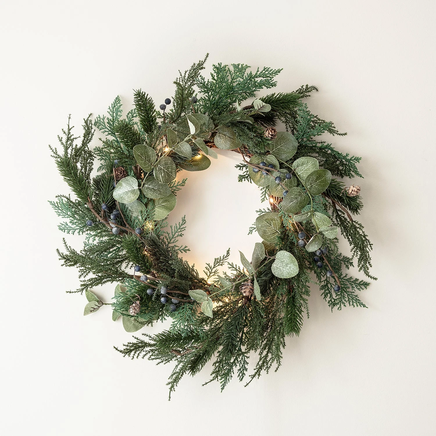 Unser Weihnachtskranz bestückt mit Kiefernblättern, Eukalyptus, Eicheln und dunklen Beeren ist das perfekte Accessoire für deine Haustür oder deinen Kaminsims. Er wird mit unserer 50er LED Lichterkette geschmückt geliefert. Dank der praktischen Timerfunktion, die in der Lichterkette integriert ist, schalten sich die Lichter ganz automatisch ein und aus.