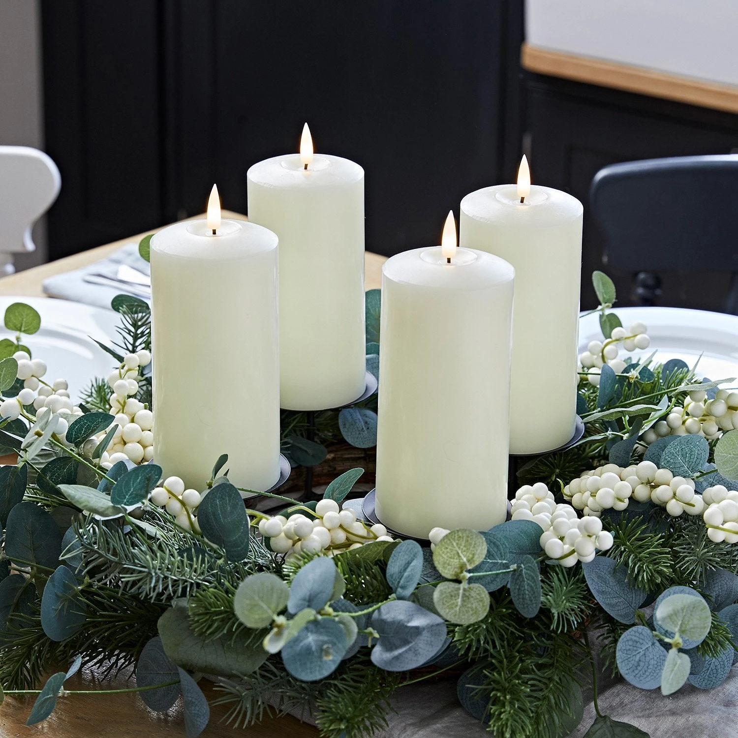 Unserer Kunstkranz mit weißen Beeren und das TruGlow® Kerzenquartett verleiht deinem Weihnachtsdekor festlichen Charme. Kombiniere den Kranz mit dem beigefügten Kerzenständer mit 4 Tellern, das harmoniert wunderbar. Drück einfach den schwarzen Metallständer durch den Kranz, und du erzielst du den perfekten Dekor. Mit den 4 angehobenen Tellern werden die Kerzen zum Blickfang, und verbreiten einen warmweißen Glanz. Der Kranz mit weißen Beeren und Eukalyptus ergänzt dein Arrangement auf elegante Weise und verleiht diesen klassischen Kerzen ein dekoratives Finish. Unsere unglaublich realistischen TruGlow® Kerzen aus echtem Wachs kombinierten wir mit innovativer Technologie, um das Flackern echter Flammen zu imitieren. Leg einfach die Batterien ein, und verwende den Timer, damit der Kranz jeden Abend automatisch leuchtet.