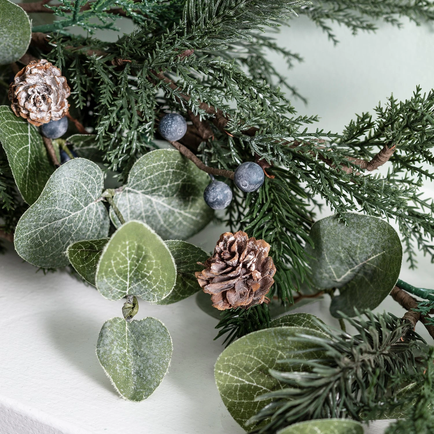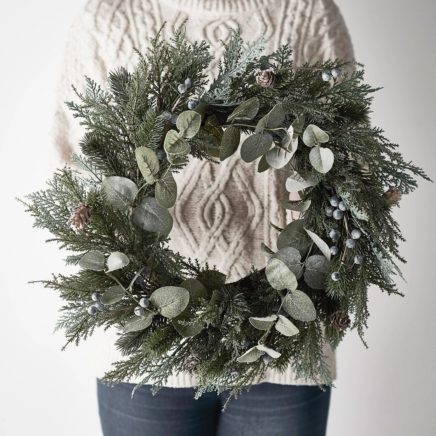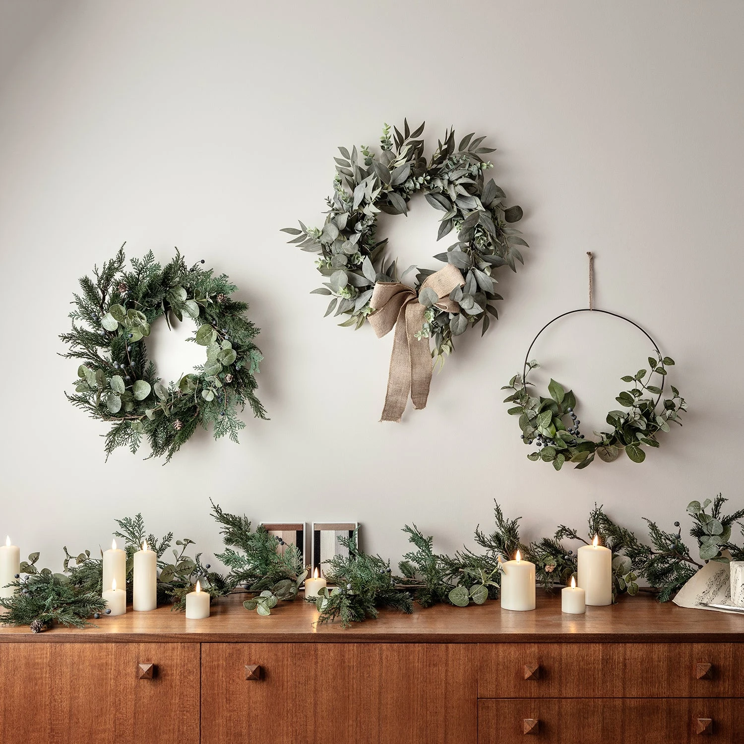 Unser künstlicher Nadelkranz ist bestückt mit Kieferblättern, Eukalyptus, Eicheln und dunklen Beeren. Er ist eine tolle Weihnachtsdekoration an deiner Haustür oder in der Mitte deines Esstisches in Kombination mit LED Kerzen. Wenn du den Kranz mit unserer 50er LED Micro Lichterkette umwickelst, bringst du ihn zusätzlich zum Leuchten.