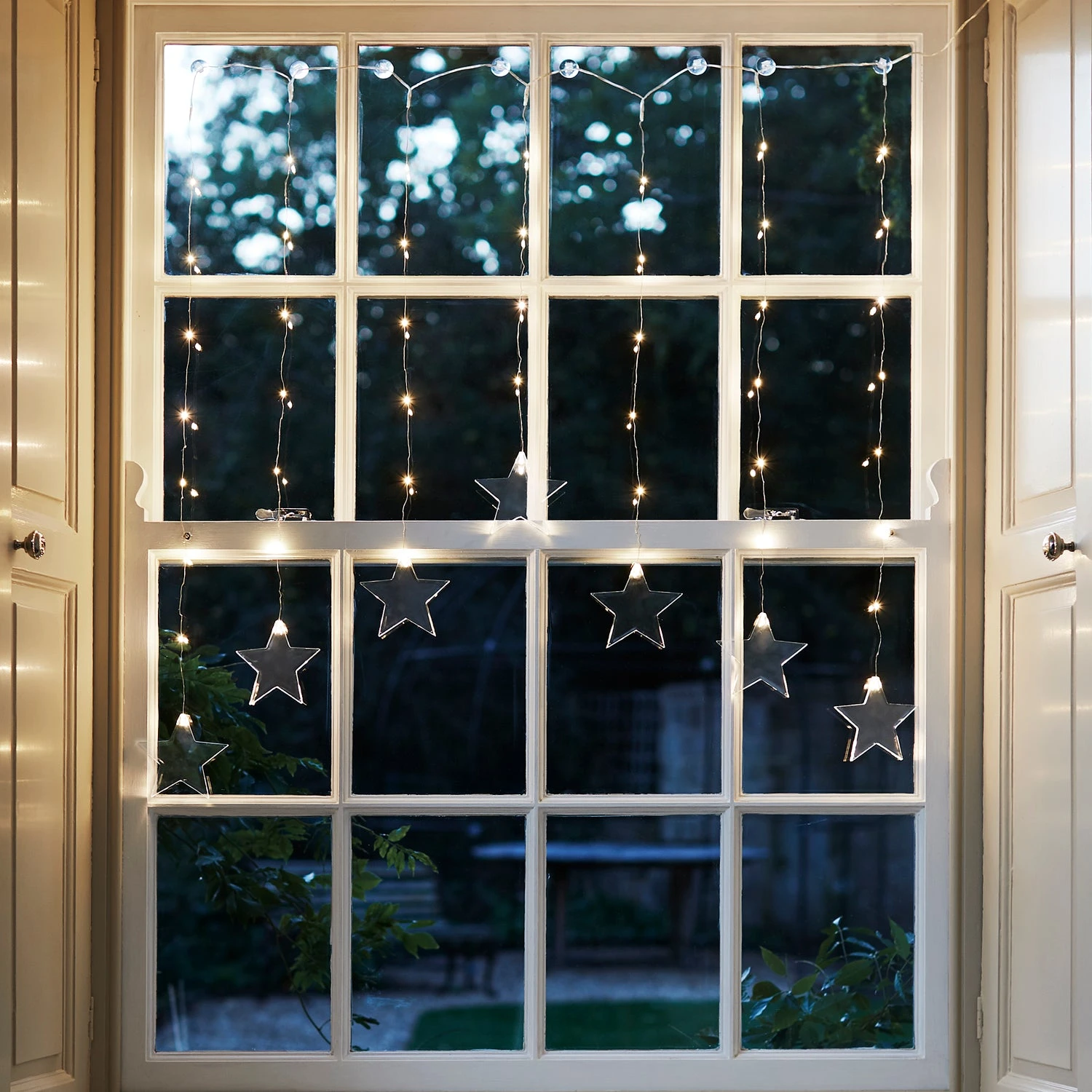 Erschaffe mit diesem Sternenvorhang eine atemberaubende Atmosphäre. Insgesamt 47 perlweiße Micro LEDs verteilen sich über die sieben jeweils 80cm langen Silberdrähte. Am Ende jedes Strangs befindet sich ein Stern, der einen Durchmesser von 10cm hat und aus klarem Plexiglas gefertigt ist.