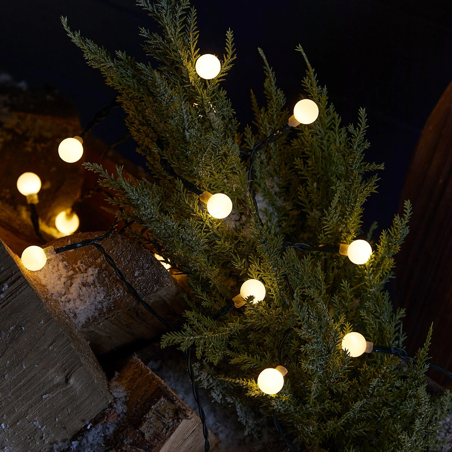Unsere Lichterkette mit Kugeln eignet sich hervorragend, um Sträucher und Pflanzen im Außenbereich festlich zu illuminieren. Die 50 LED Kugeln verteilen sich auf einem 4,9m grünen Kabel, das zwischen Zweigen und Blättern wunderbar unauffällig ist. Jede Kugel enthält eine warmweiße LED. Lege einfach Batterien ein und die praktische Timerfunktion sorgt dafür, dass sich die Lichter allabendlich automatisch zur gleichen Zeit für 6 Stunden einschalten. Du kannst mit bis zu 160 Stunden Leuchtdauer rechnen, bevor die Batterien gewechselt werden müssen.