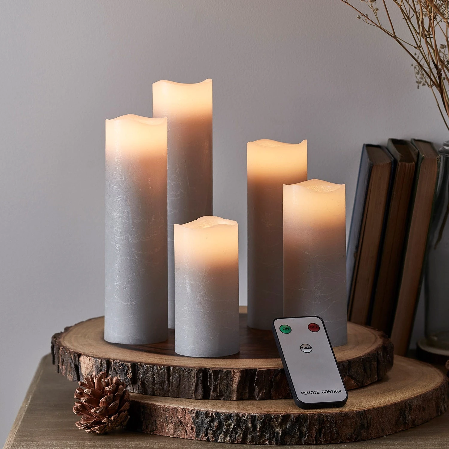 Unsere Stumpenkerzen aus grauem Wachs sind eine elegante Ergänzung in jedem Wohnbereich. Ob als Tischdeko oder als Hingucker auf einem Regal, das warmweiße Flackern verbreitet eine gemütliche Stimmung. Schalte die Kerzen mit Hilfe der Fernbedienung ein und aus oder verwende den praktischen 6 Stunden Timer.