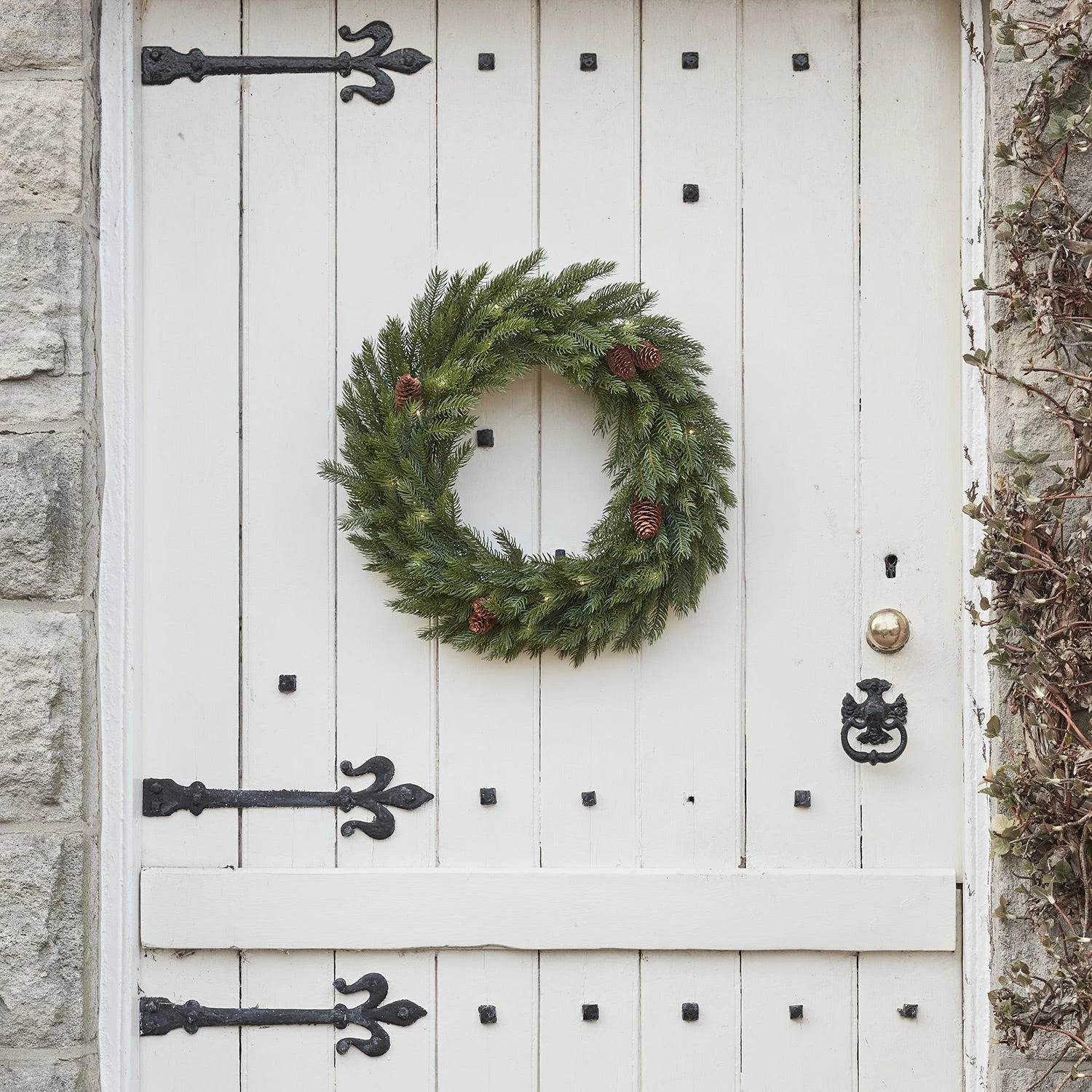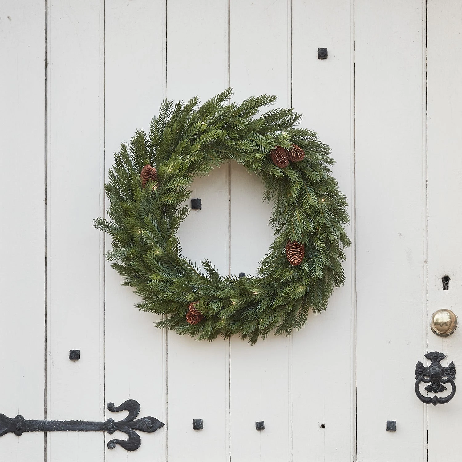 Mit unserem beleuchteten Weihnachtskranz für den Außenbereich heißt du die festliche Jahreszeit herzlich willkommen. Er hat einen Durchmesser von 61cm und seine wasserfesten künstlichen Nadeln erwecken den Anschein eines sehr realistischen üppigen Kranzes. Zwischen dem Grün zieren echte Tannenzapfen den Kranz und sorgen für ein ganz traditionelles Weihnachtsgefühl. Am Abend wird er durch 50 warmweiße LEDs zum Leben erweckt und funkelt in einer kalten Winternacht mit den Sternen um die Wette. Lege einfach 3x AA-Batterien (separat erhältlich) in die Batteriebox und hänge den Weihnachtskranz draußen an deine Haustür. Für eine automatische Beleuchtung am Abend kannst du den praktischen 6-Stunden-Timer verwenden. Um einen besonders festlichen Empfang zu schaffen, bietet es sich an, den Kranz mit der passenden Girlande mit Tannenzapfen zu kombinieren (separat erhältlich).