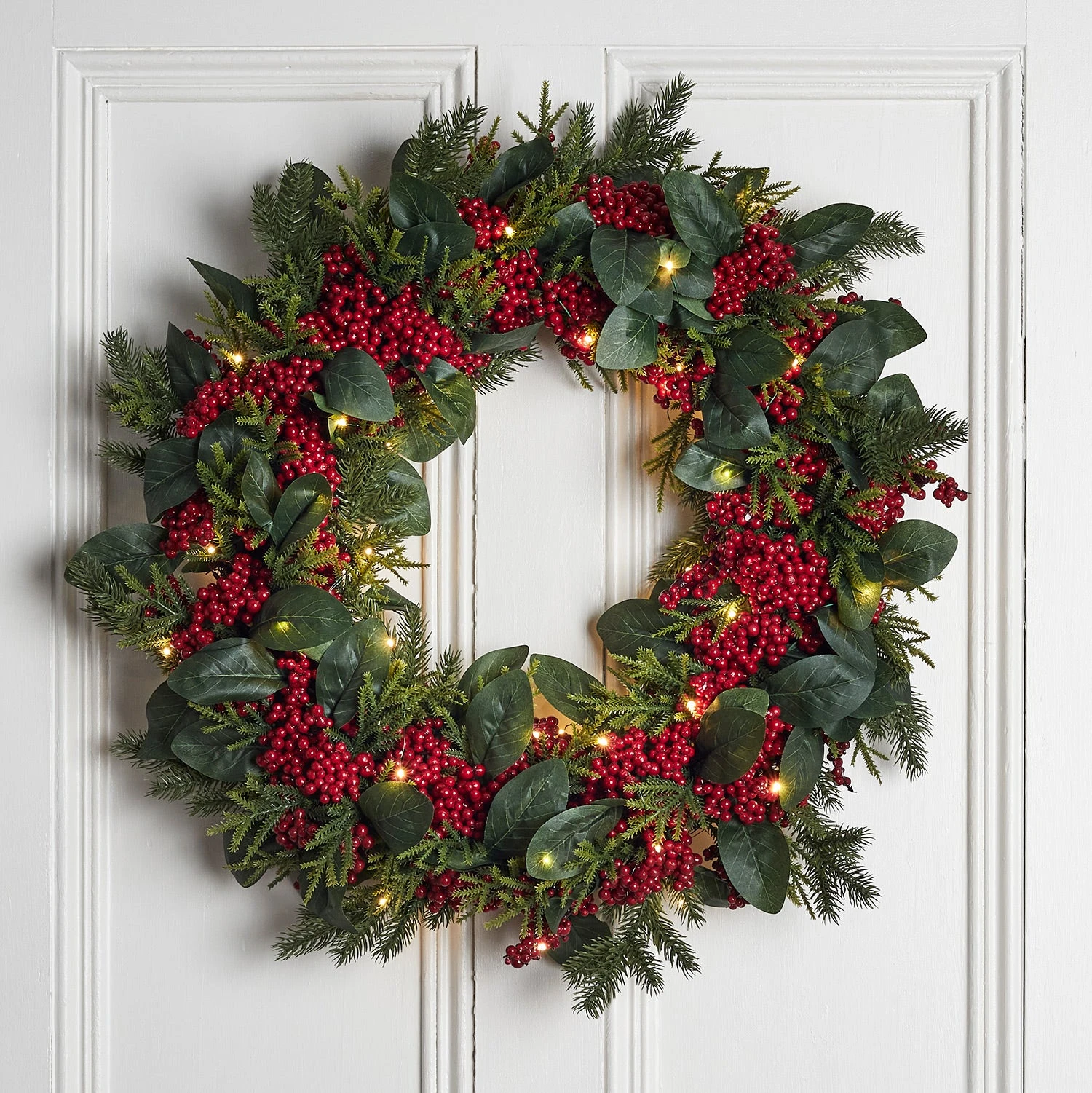 Beeindruckend sind nicht nur die Farben, sondern auch die Größe unseres mit Beeren bestückten Kranzes. Der mit 50 warmweißen Micro LEDs verzierte Kranz springt allen deinen Gästen sofort ins Auge! Das festliche Dekostück machtsich wunderbar an der Tür oder auf dem Kaminsims und verbreitet ein wohliges Weihnachtsgefühl. Der 4,9m lange Draht ist kaum sichtbar zwischen den Kunstzweigen. Lege einfach 3x AA Batterien ein und verwende den 6-Stunden-Timer, damit der Kranz jeden Abend automatisch leuchtet.