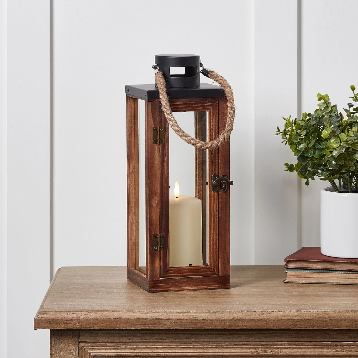 Mit unserer großen Holzlaterne und LED Kerze holst du dir ein rustikales Landhausgefühl in dein Zuhause. Unsere exklusive TruGlow® Stumpenkerze aus echtem Wachs verfügt über eine realistisch flackernde Flamme und ist absolut sicher in der Nähe von Kindern und Haustieren. Mit einer Höhe von 34cm sieht die Laterne auf Beistelltischen oder vor deinem Kamin großartig aus und kann mit unserer passenden kleinen Laterne kombiniert werden, um ein perfekt gemütliches Ambiente zu schaffen. Lege einfach 2 x AA-Batterien (separat erhältlich) in den Kerzensockel ein und aktiviere den optionalen 6-Stunden-Timer, damit die Kerze jeden Abend zur gleichen Zeit leuchtet.