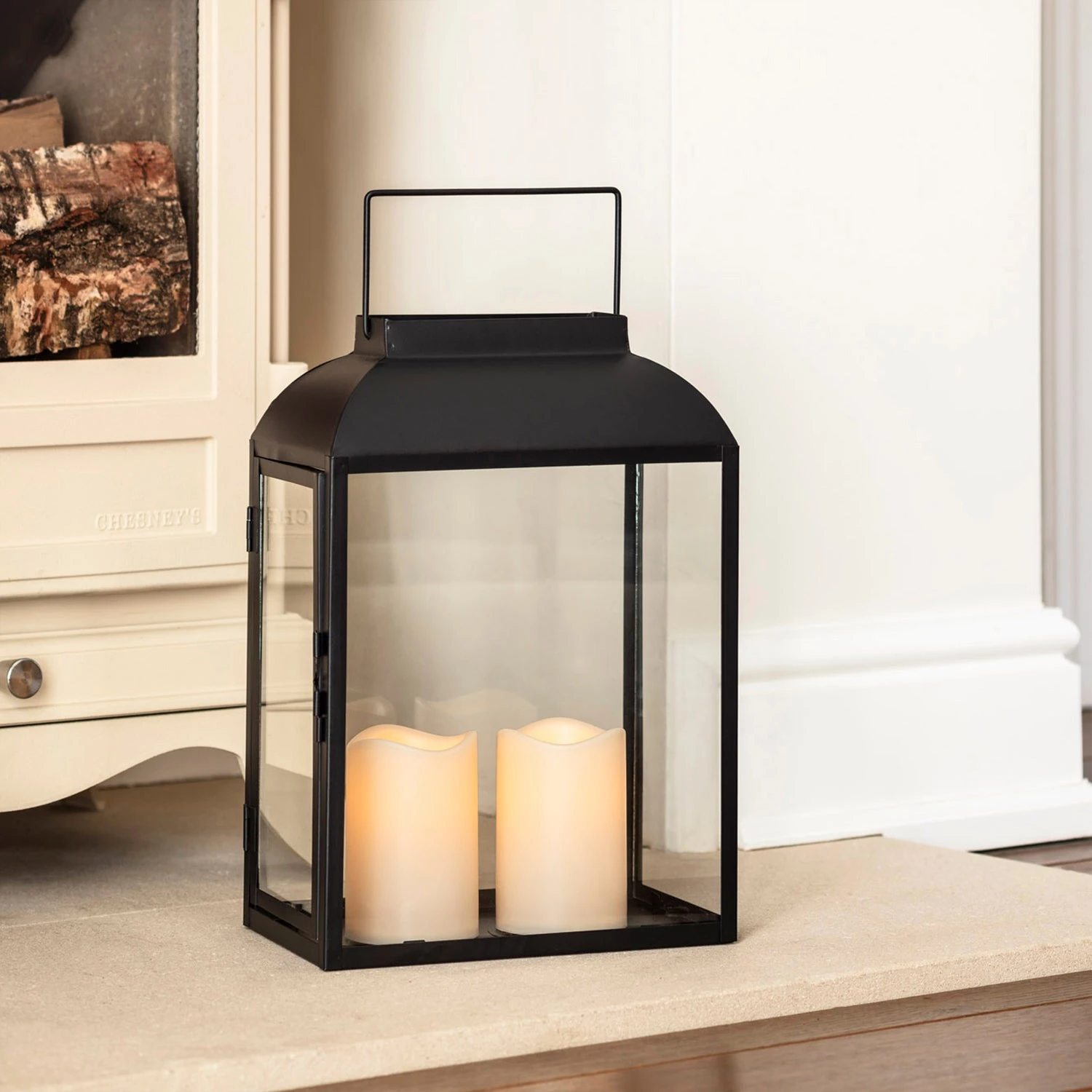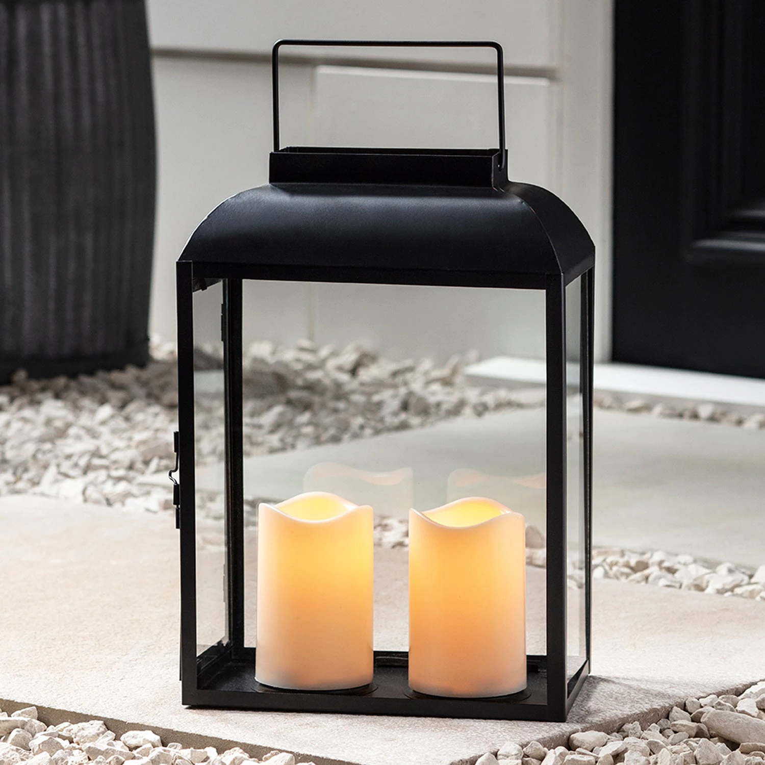 Unsere elegante Devon Laterne mit mattschwarzem Metallrahmen und Glasfenstern sorgt für einen zeitlosen Leuchteffekt. Mit einer Höhe von 35cm ist sie ideal für deinen Eingangsbereich oder die Veranda. Diese Laterne beherbergt zwei cremefarbene Kerzen, die jeweils durch eine warmweiße, flackernde LED Flamme beleuchtet werden. Jede Kerze misst 11,5 x 7,5 cm. Nachdem du 3 x AA Batterien in jeden Kerzenboden eingelegt hast, kannst du den praktischen 6-Stunden-Timer aktivieren, damit sie sich jeden Abend um dieselbe Uhrzeit einschalten und einen sanften Lichtschein verbreiten. Du kannst mit bis zu 1200 Stunden Leuchtdauer rechnen, bis die Batterien ausgetauscht werden müssen.