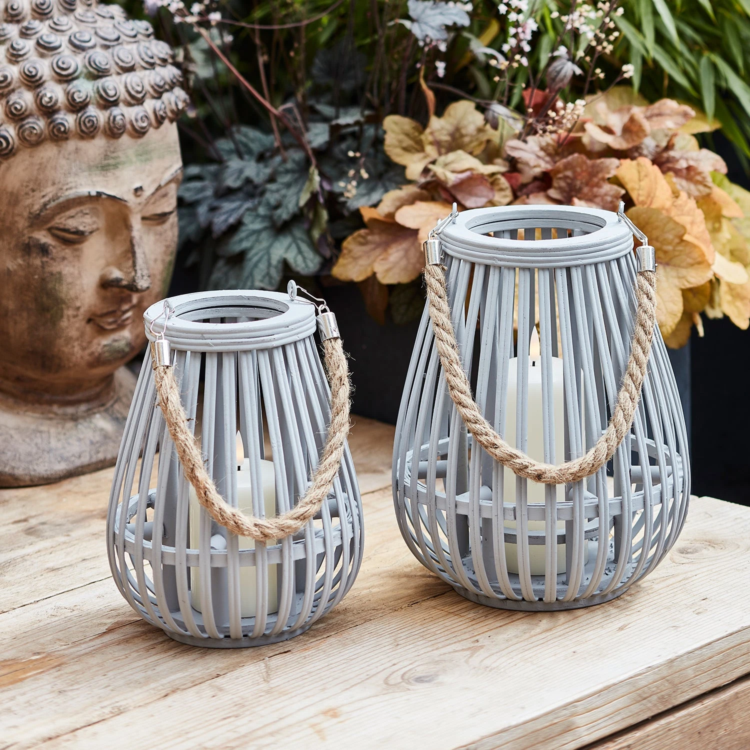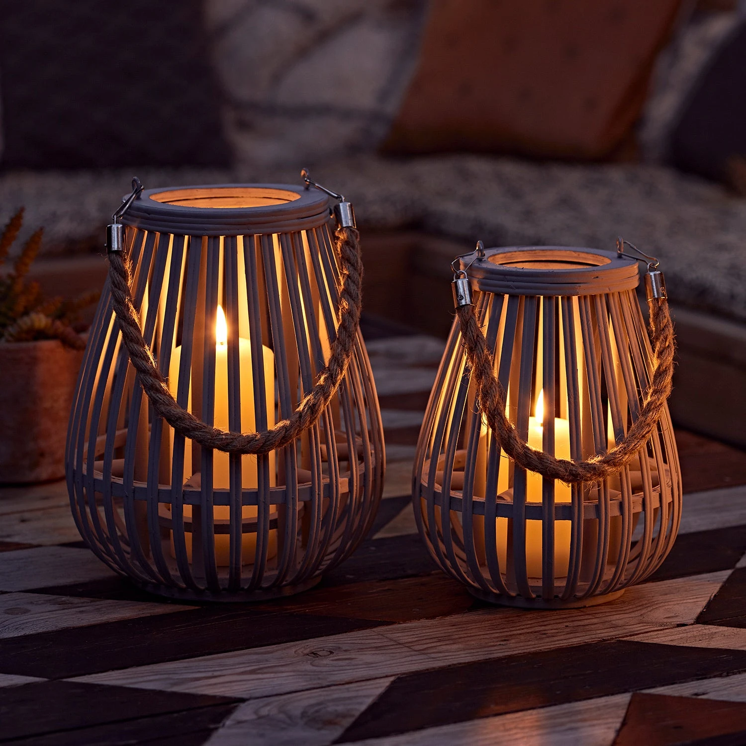 Diese schöne große Dekolaterne in Grau besitzt Lamellen aus Bambus und eine realistisch wirkende TruGlow® LED Outdoor Kerze im Inneren. Mit einer Höhe von 26cm ist sie eine tolle Deko für den Balkon oder die Terrasse und sorgt auch im Innenbereich für ein entspanntes Ambiente. Sie ist für den gelegentlichen Gebrauch im Außenbereich geeignet, aber wir empfehlen, sie über die Wintermonate ins Haus zu holen, damit sie im besten Zustand bleibt. Lege zur Betätigung einfach 2x C Batterien in die Kerze ein und genieße dank des eingebauten Timers jeden Abend eine 6-stündige Beleuchtung.