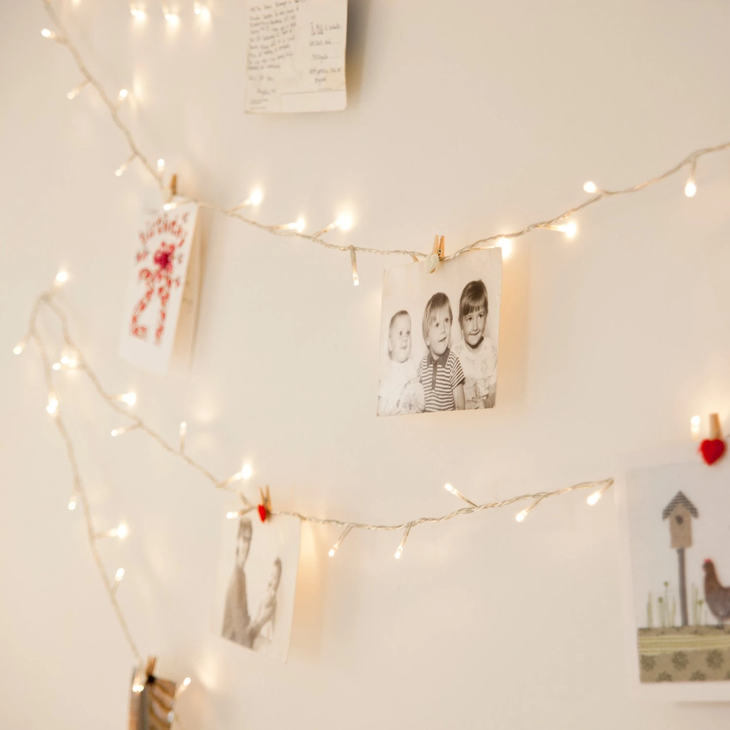 Top Tipp – Kreiere funkelnde Erinnerungen! Bringe die Lichterkette an der Wand an und hänge mit Hilfe von kleinen Holzklammern Fotos an dem Kabel auf. (Die Holzklammern sind nicht im Lieferumfang enthalten.)