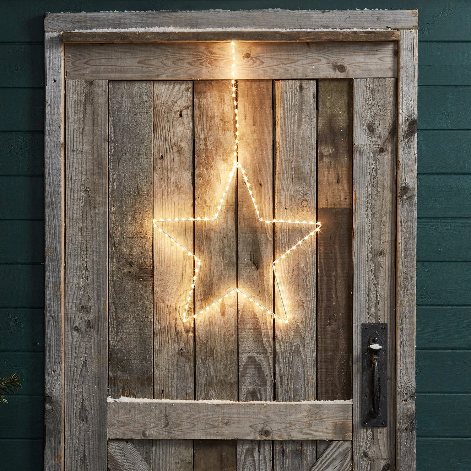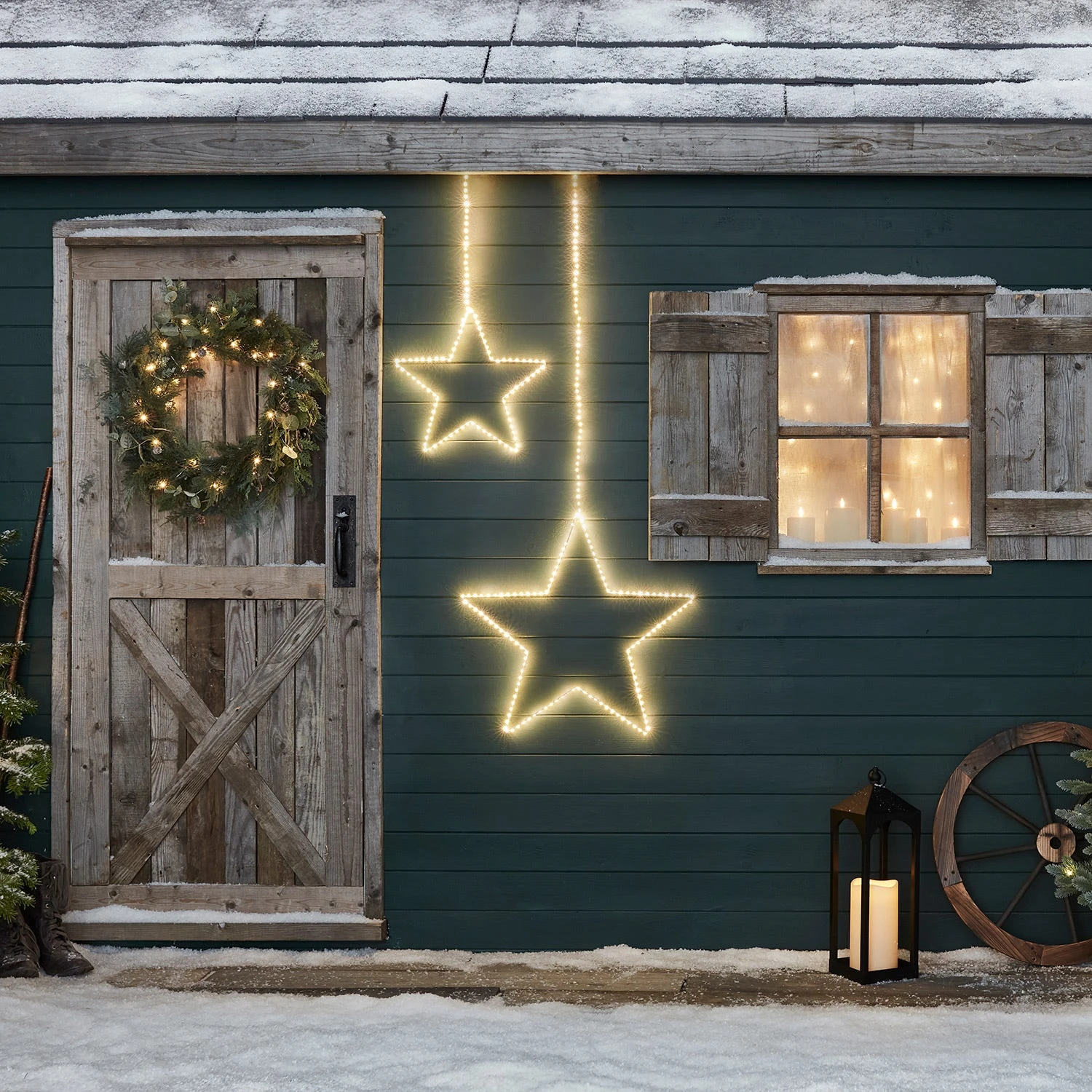 Unsere beiden Micro LED Sterne sind eine elegante Außendeko in der Weihnachtszeit! Sie sind echte Hingucker an der Hauswand und auch im Innenbereich machen sie sich toll an Wänden und in Fenstern. Insgesamt 310 warmweiße LEDs lassen die Sterne mit einem Durchmesser von jeweils 58cm und 38cm und ihre praktischen Kabel zum Aufhängen festlich strahlen. Jeder Stern hat eine 5m lange Zuleitung zum Stecker, die es dir erleichtert, die nächsten Steckdosen zu erreichen. Aktiviere den 6-Stunden-Timer, damit das Duo jeden Abend automatisch zur gleichen Zeit zu leuchten beginnt.