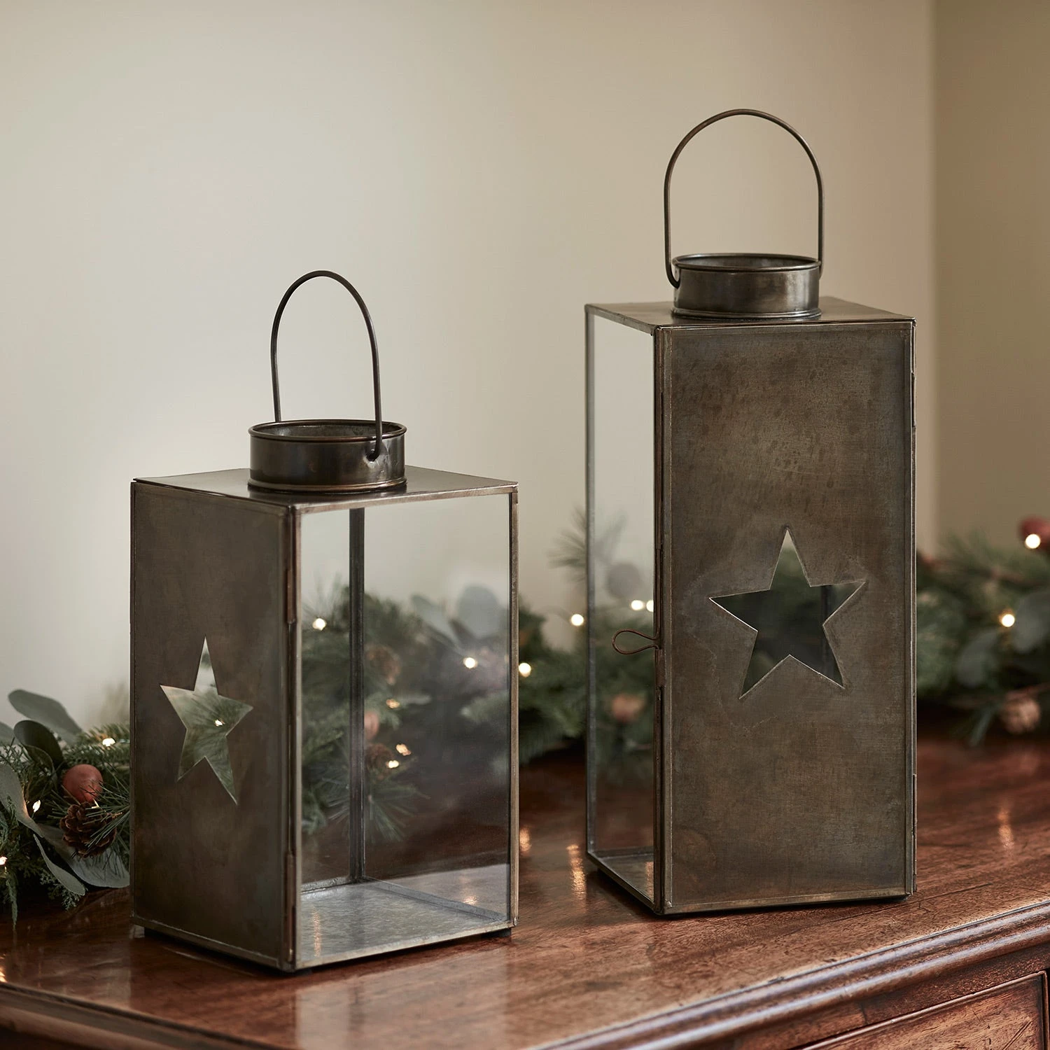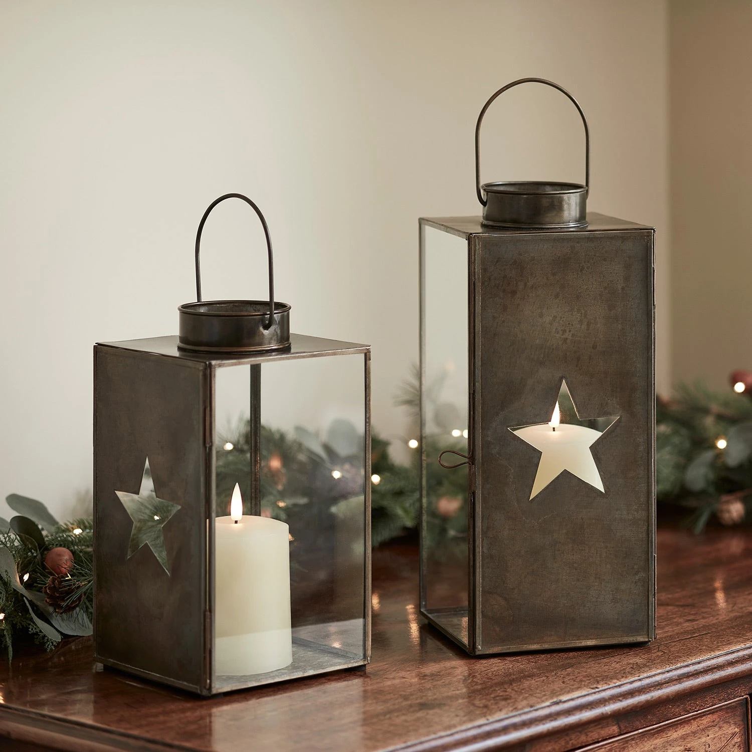 Ein dekoratives Duo für die Weihnachtszeit und die restlichen Wintermonate: Unsere LED Laternen mit charmantem Stern-Design sorgen für Gemütlichkeit, wenn es draußen regnet und schneit. Die Metalllaternen mit Messing-Finish sind mit jeweils einer unserer klassischen TruGlow® LED Kerzen ausgestattet. Diese wirken mit ihrem sanften Flackern beeindruckend realistisch und haben den Vorteil, dass sie im Gegensatz zu echten Kerzen auch unbeaufsichtigt gelassen werden können. So kannst du mit den Sternlaternen auch zum Beispiel den Flur schmücken. Mit ihren unterschliedlichen Höhen von 33cm und 26cm ergeben sie zusammen ein absolut stimmiges Bild.