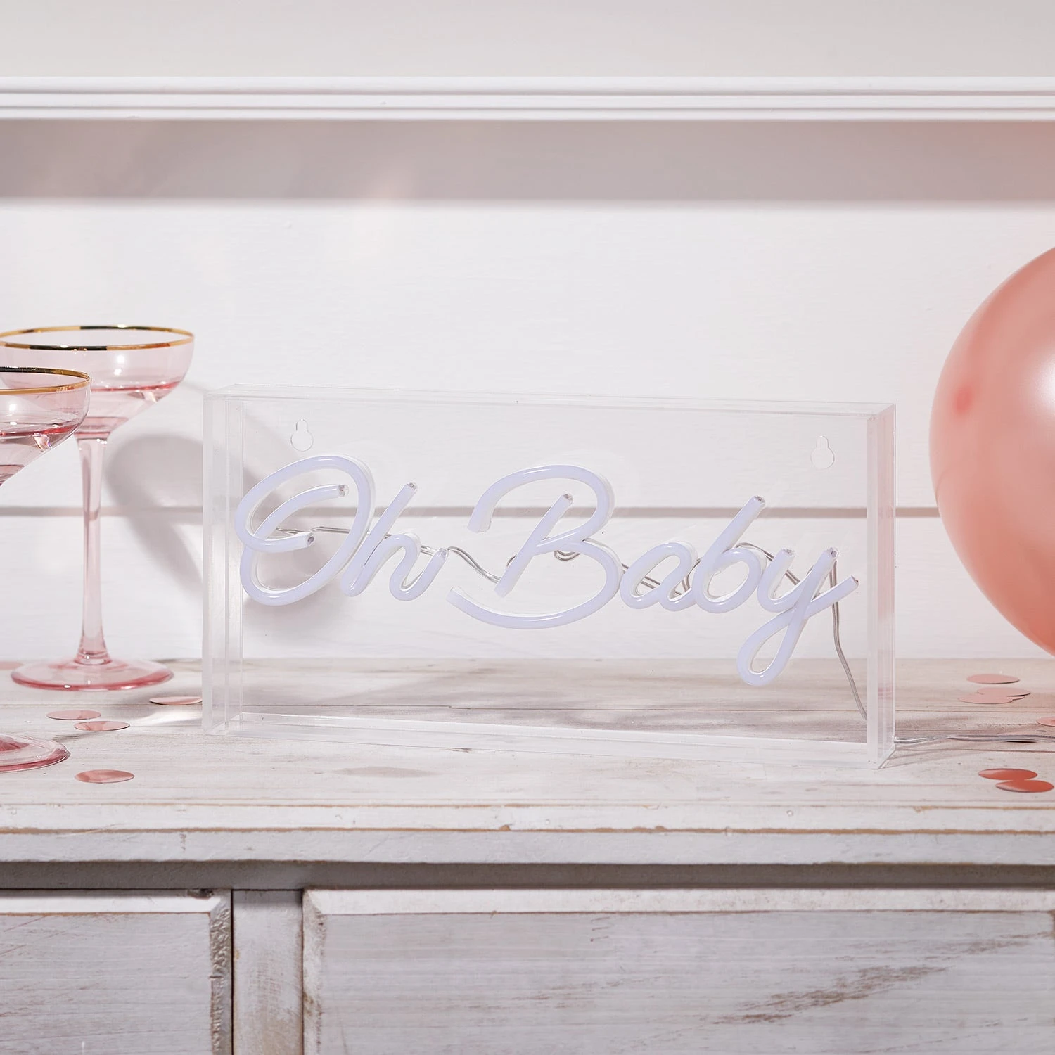 Oh baby! Diese warmweiß leuchtende Neonschrift ist die ideale Deko fürs Babyzimmer oder für eine Babyparty. Die Worte „Oh Baby“ befinden sich in einer transparenten Box aus Acryl und können so ganz einfach auf geraden Oberflächen platziert werden. Die 3m lange Zuleitung zum Stecker gibt dir viel Freiraum beim Dekorieren. Nach dem Einstecken in die Steckdose, kannst du einfach den praktischen Wippschalter am Kabel nutzen, um das Licht ein- und auszuschalten.