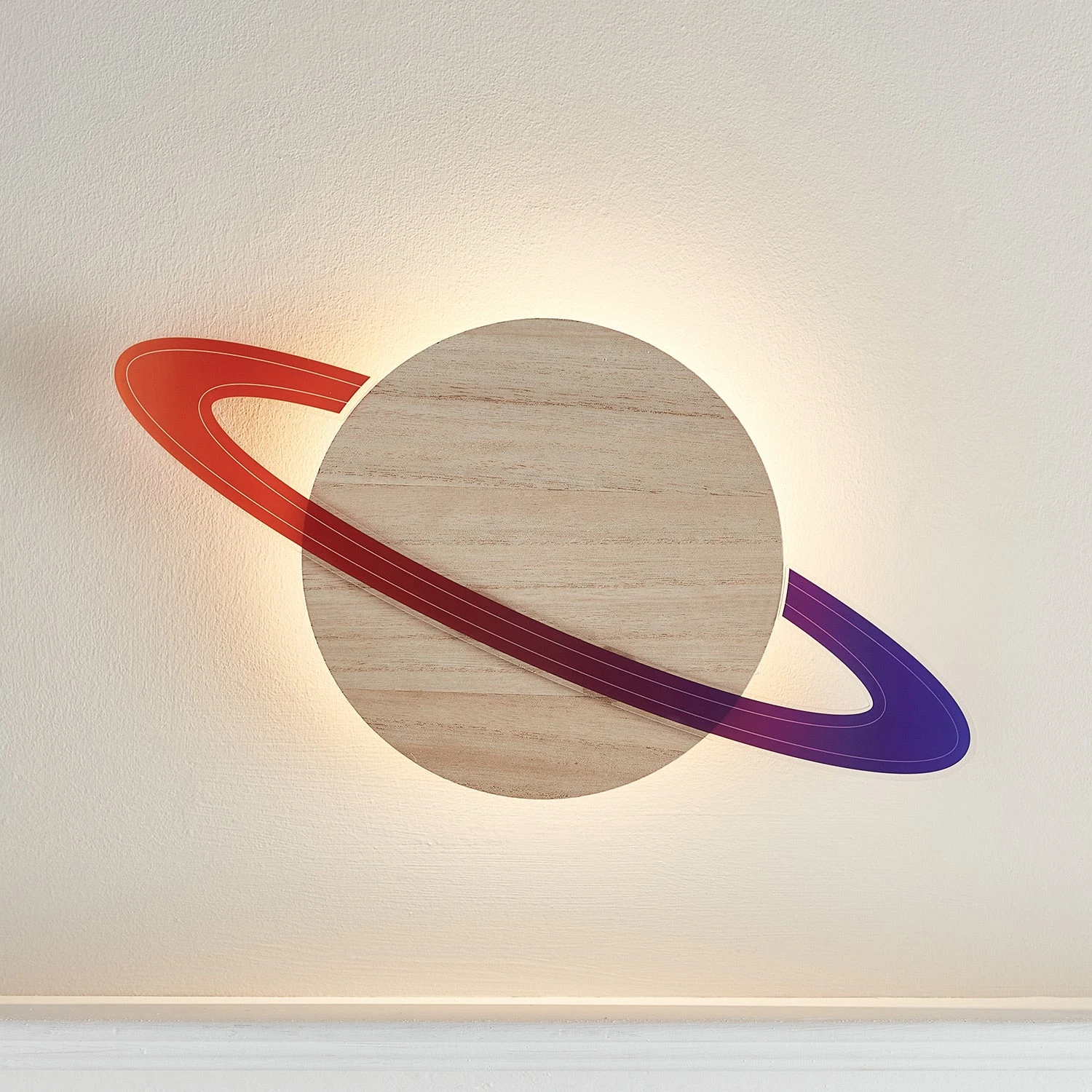 Diese Planeten Wandlampe ist ein Muss für das Schlafzimmer eines jeden kleinen Weltraumforschers! Unser Saturn ist aus Holz und Acryl gefertigt und wird von insgesamt 18 warmweißen LEDs beleuchtet, die für ein sanftes Licht im Kinderzimmer sorgen. Lege einfach 3 x AAA Batterien in das Batteriefach ein und befestige die Leuchte mit dem Aufhängeloch auf der Rückseite an einer Wand. Mit dem praktischen Wippschalter lässt sich der Planet nach Belieben ein- und ausschalten. Verwende die dazugehörige Fernbedienung und stelle den optionalen 6-Stunden-Timer ein, damit die Lampe jeden Abend zur gleichen Zeit leuchtet.