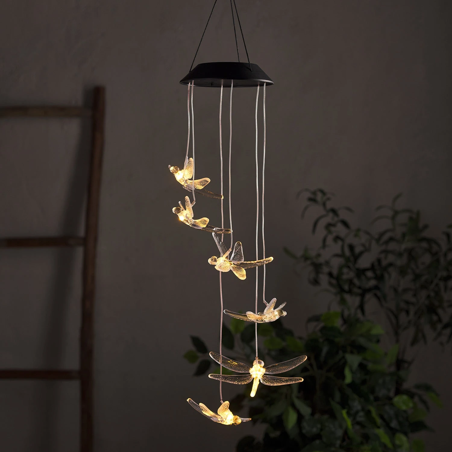 Begrüße den Sommer mit unserem bezaubernden Solar-Mobile! Die 6 durchsichtigen Libellen mit filigranen Flügeln bestehen aus Acryl und beherbergen jeweils eine warmweiße LED, welche für eine magische Sommerkulisse im Garten sorgt. Das von der Sonne betriebene Mobile bietet eine umweltschonende Möglichkeit, deinen Außenbereich in ein gemütliches Licht zu tauchen und eignet sich perfekt zum Aufhängen an Bäumen oder an einem Pavillon. Platziere das Mobile tagsüber zum Aufladen an einem sonnigen Ort und am Abend beginnt es automatisch zu leuchten.