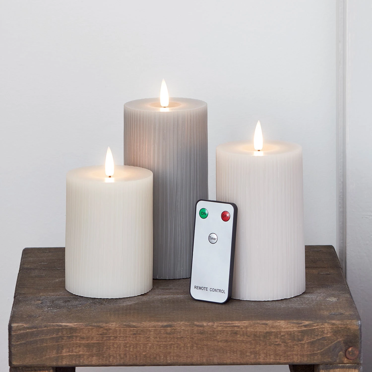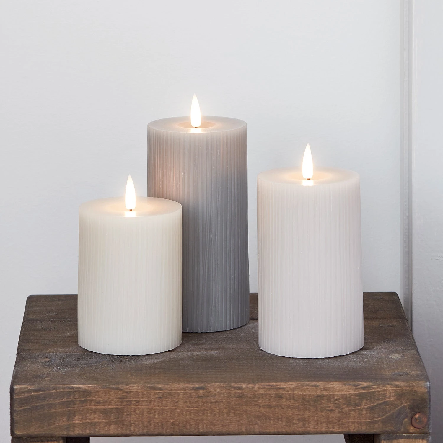 Diese LED Stumpenkerzen unserer TruGlow®-Serie haben mit ihren neutralen Grautönen einen besonders modernen Look. Die Kerzen sind 10cm, 12,5cm und 15cm hoch und ihr zart geriffeltes Design macht sie zu einem eleganten Accessoire für dein Zuhause. Handgegossenes Wachs in Kombination mit innovativer Technologie, die das Flackern echter Flammen perfekt imitiert, lässt unsere LED Kerzen unwahrscheinlich realistisch aussehen. Lege einfach 2 x AA Batterien in jede Kerze ein, um ein gemütliches Licht in deinen Räumen zu erzeugen. Mit dem optionalen 6-Stunden-Timer leuchten die Kerzen jeden Abend zur gleichen Zeit und du musst nicht daran denken, sie vor dem Schlafengehen auszuschalten.