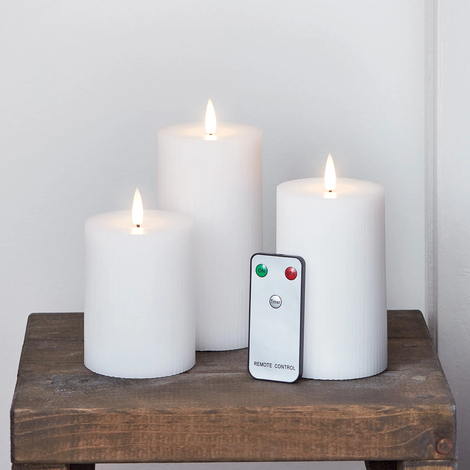 Unser weißes TruGlow® Trio im geriffelten Design könnte nicht eleganter aussehen und ist eine wunderbare Ergänzung für dein Zuhause! Bei diesen Kerzen kombinieren wir handgegossenes Wachs mit innovativer Technologie, die das Flackern echter Flammen perfekt imitiert. Die Kerzen sind 10cm, 12,5cm sowie 15cm hoch und ihr Kerzenlicht bleibt immer kühl, weshalb sie problemlos mit deiner übrigen Deko in Berührung kommen können. Lege einfach 2 x AA Batterien ein und verwende den 6-Stunden-Timer für ein allabendliches stilvolles Leuchten in deinen Räumen.