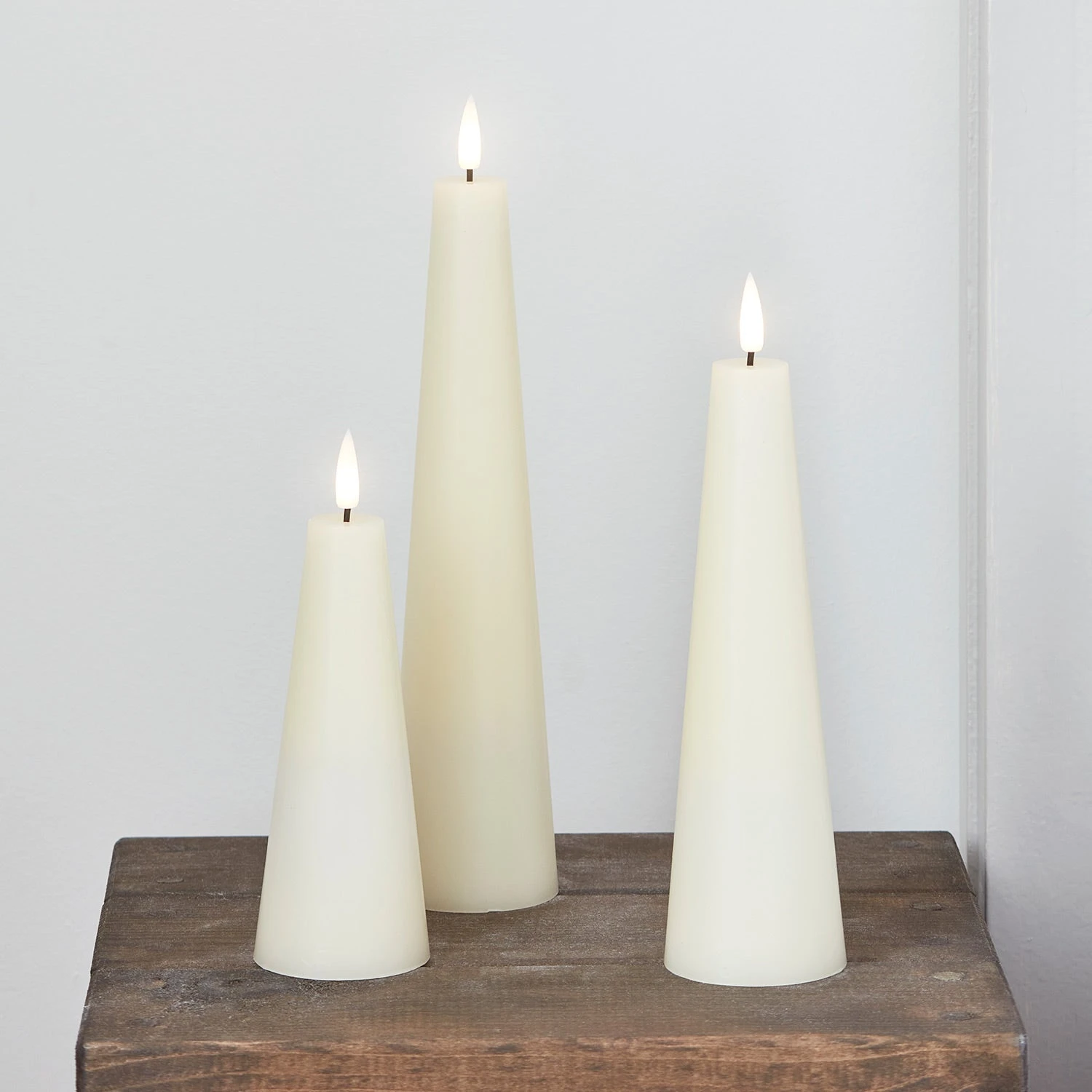 Ganz neu und exklusiv: Dieses Trio aus elfenbeinfarbenen TruGlow® Kerzen sorgt für elegantes Flair in deinem Zuhause! Die Kerzen bestehen aus handgegossenem Echtwachs und ihre realistisch flackernden LED-Flammen tauchen deine Räume in ein beruhigendes Licht. Die moderne Kegelform in den drei unterschiedlichen Höhen von 27cm, 22,5cm und 17,5cm macht jede Kerze zu einem einzigartigen Deko-Element. Lege einfach 2 x AA Batterien in den Boden jeder Kerze ein und verwende den 6-Stunden-Timer, wenn sie jeden Abend zur gleichen Zeit leuchten sollen.