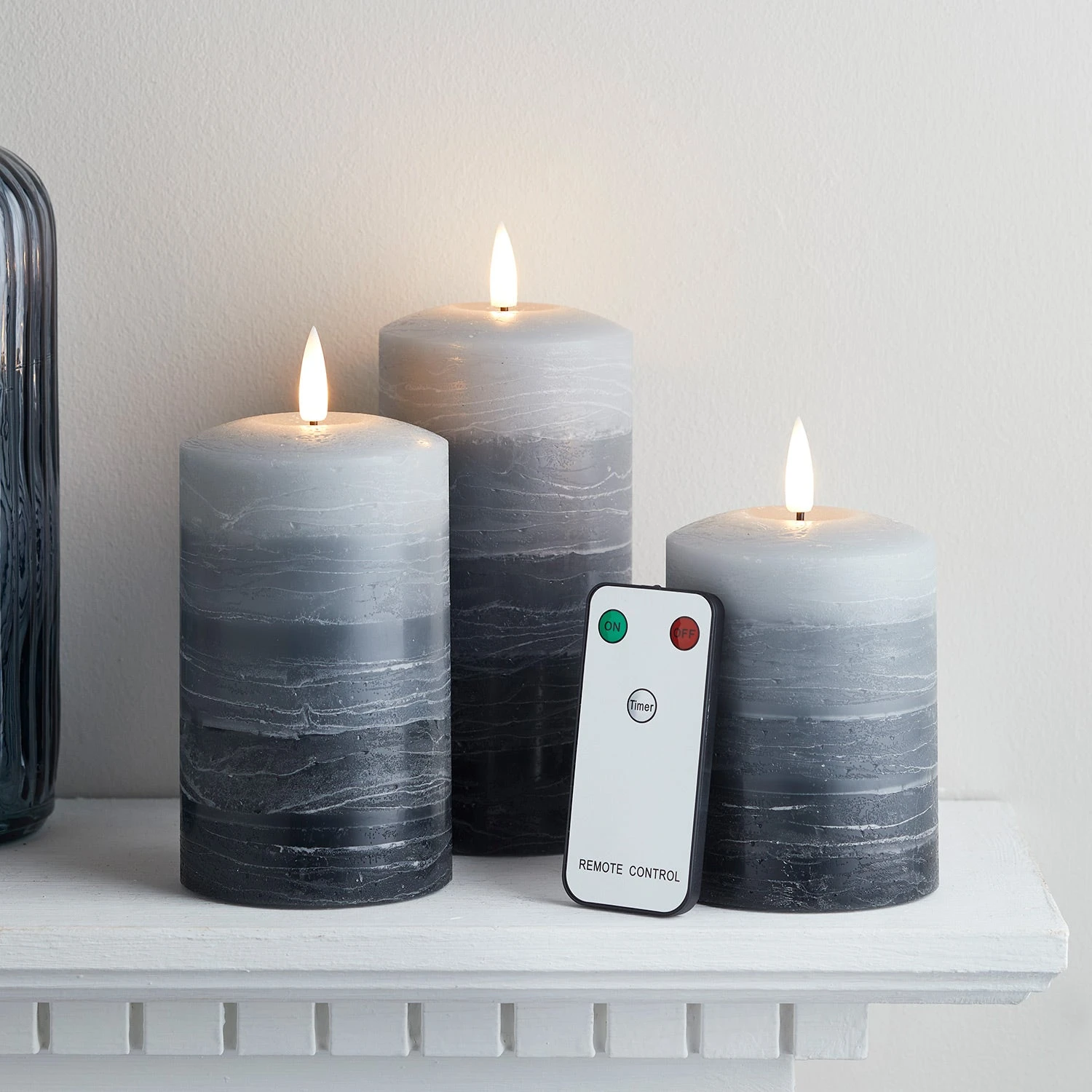 Dieses grau gestreifte Trio mit unserem TruGlow® Design bringt strahlendes Ambiente in jedes Zuhause. Die LED Kerzen sind so innovativ, dass diese eine herkömmliche Kerze täuschend echt imitieren. Eine flackernde LED Flamme mit Docht sitzt auf hand-gegossenem Wachs und sorgt für ein gemütliches Strahlen. Lege zwei AA Batterien in den Boden der Kerze ein, betätige die Timerfunktion und genieße Abend für Abend bequem das gemütliche flackern. Denn ein Satz Batterien sorgt für bis zu 600 Stunden ‘Brenndauer’. Da kann eine herkömmliche Kerze nicht mithalten.