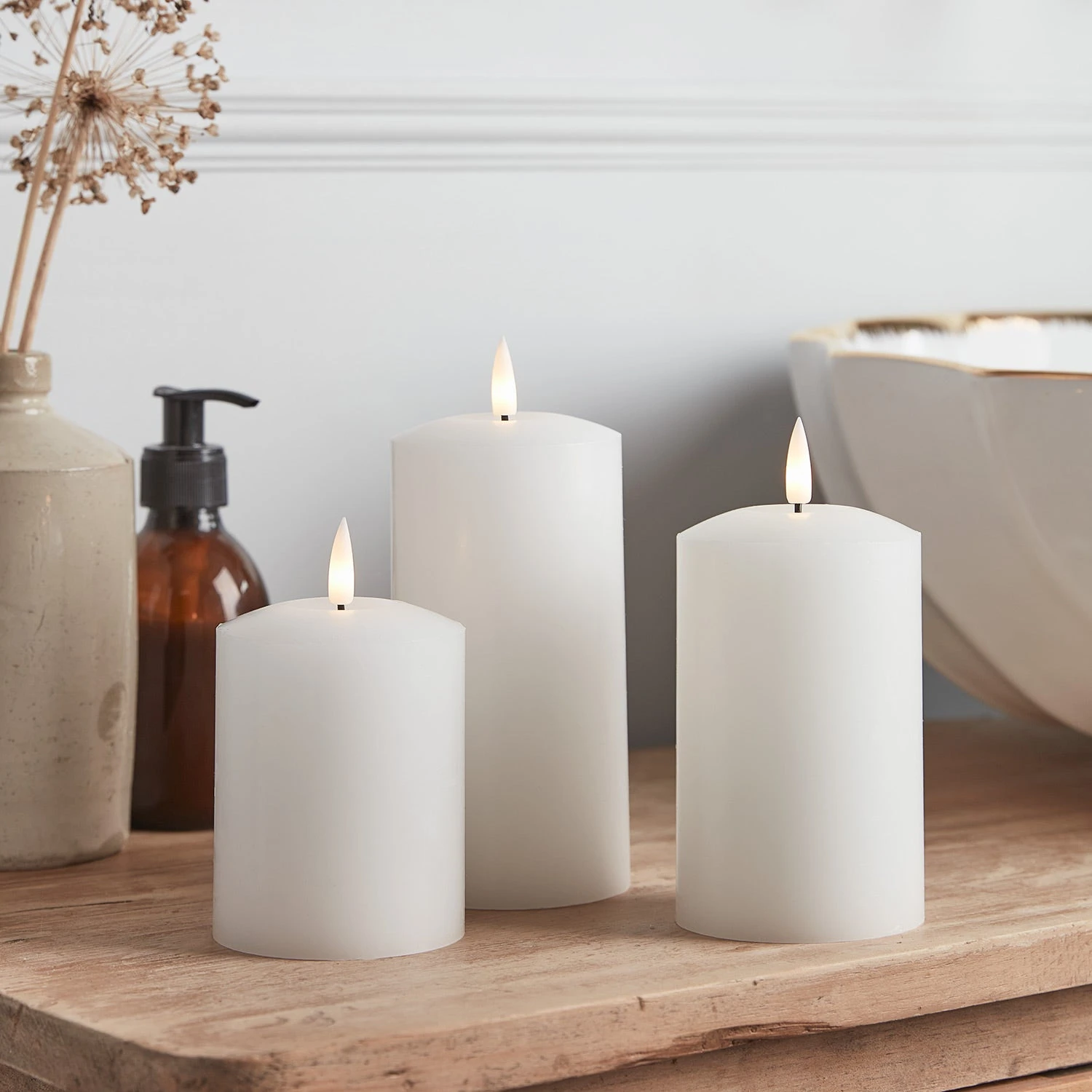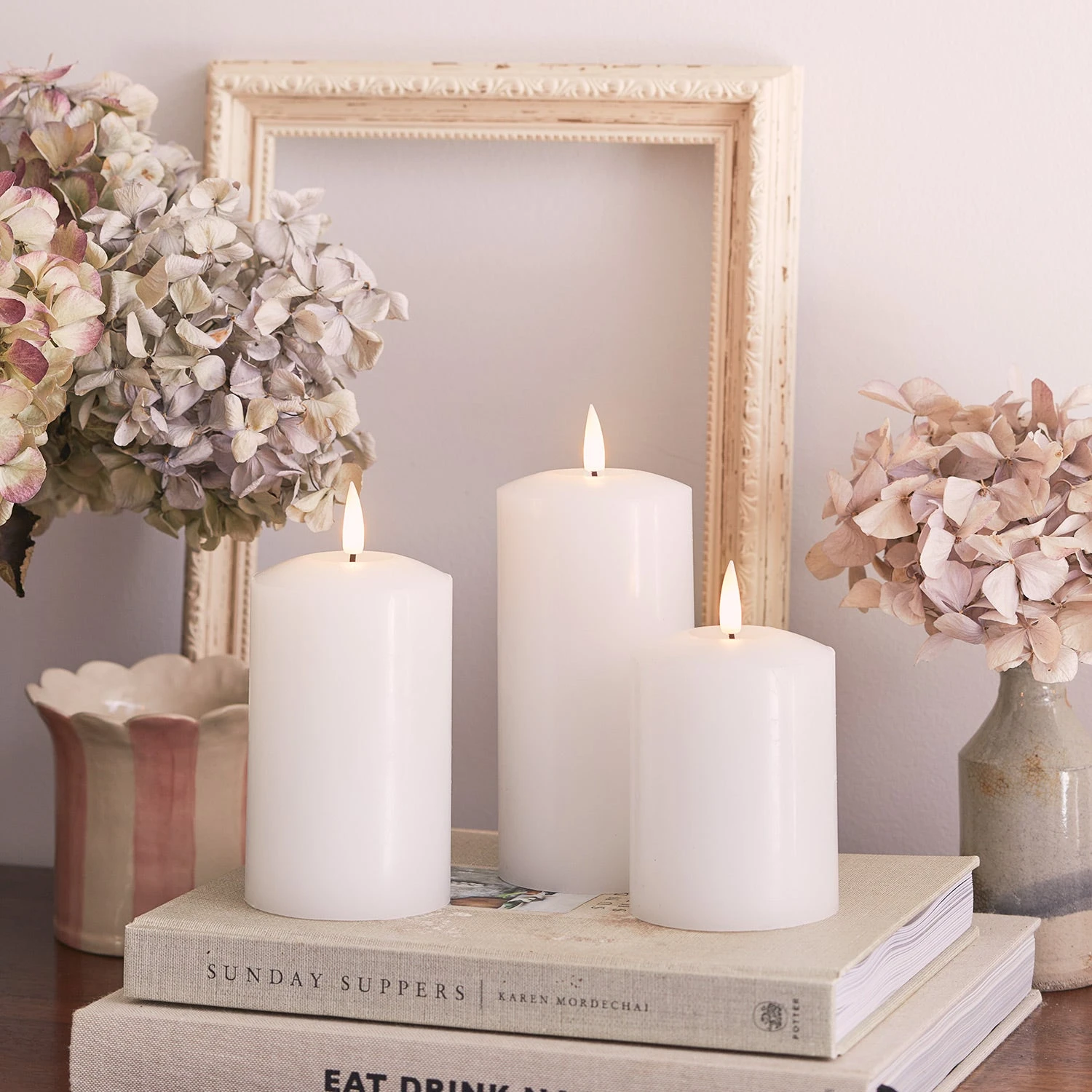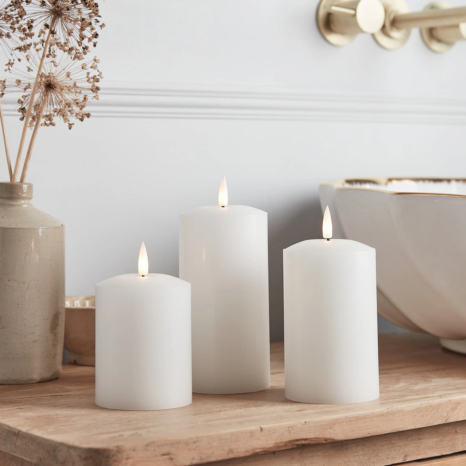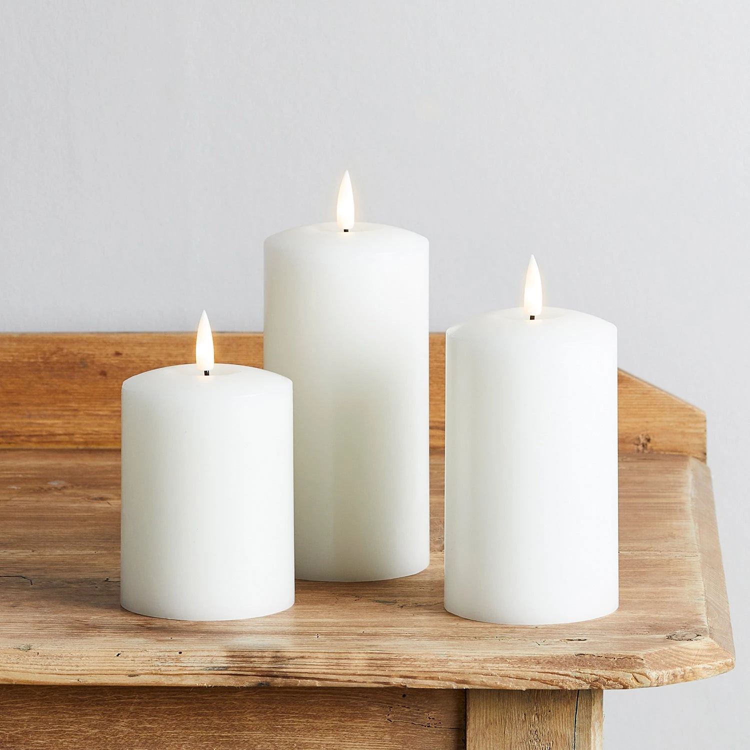 Durch das neue, verbesserte Design sind unsere TruGlow® Kerzen noch hochwertiger als zuvor: Sie bestehen nun zu einem größeren Anteil aus echtem Wachs und sehen dadurch nicht nur noch realistischer aus, sondern fühlen sich auch so an. Diese Stumpenkerzen aus handgegossenem weißen Wachs sind eine klassische Ergänzung deiner Deko. Du kannst sie sorglos überall platzieren, wo du möchtest, da sie nicht heiß werden. Die warmweißen LEDs verbreiten festlichen Glanz und dank innovativer Technologie flackern sie wie echte Flammen. Leg einfach in jede Kerze 2x AA Batterien ein, und verwende den praktischen Timer, um jeden Abend den warmen Lichtschein genießen zu können.