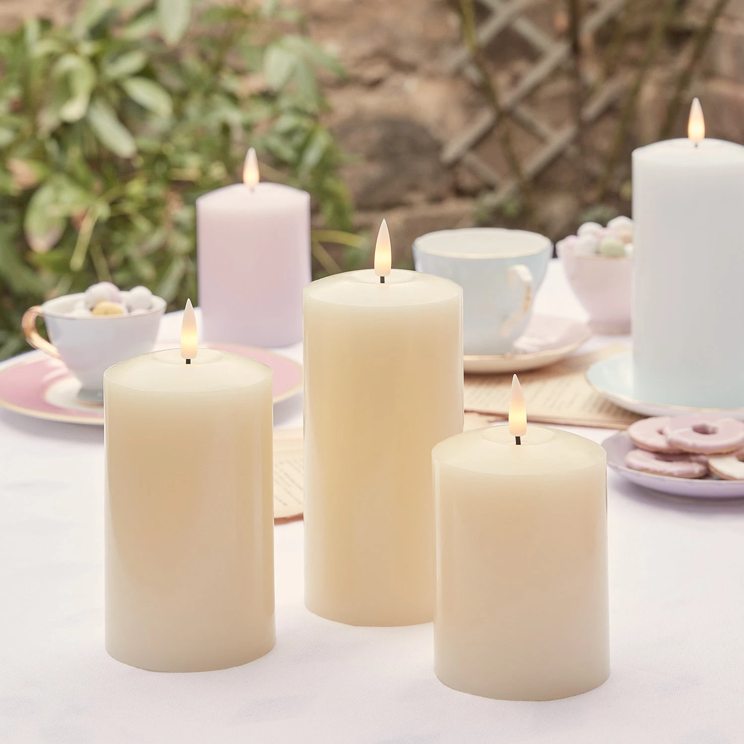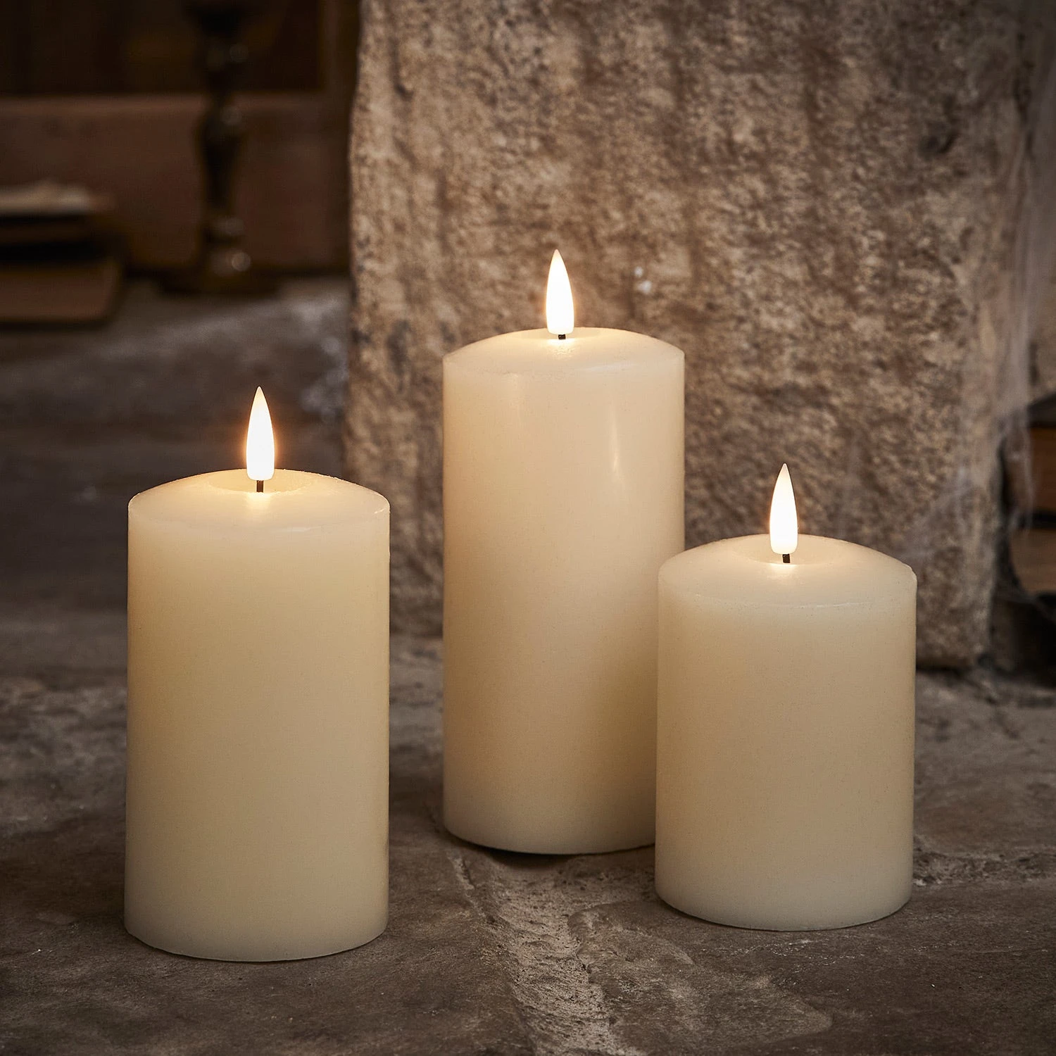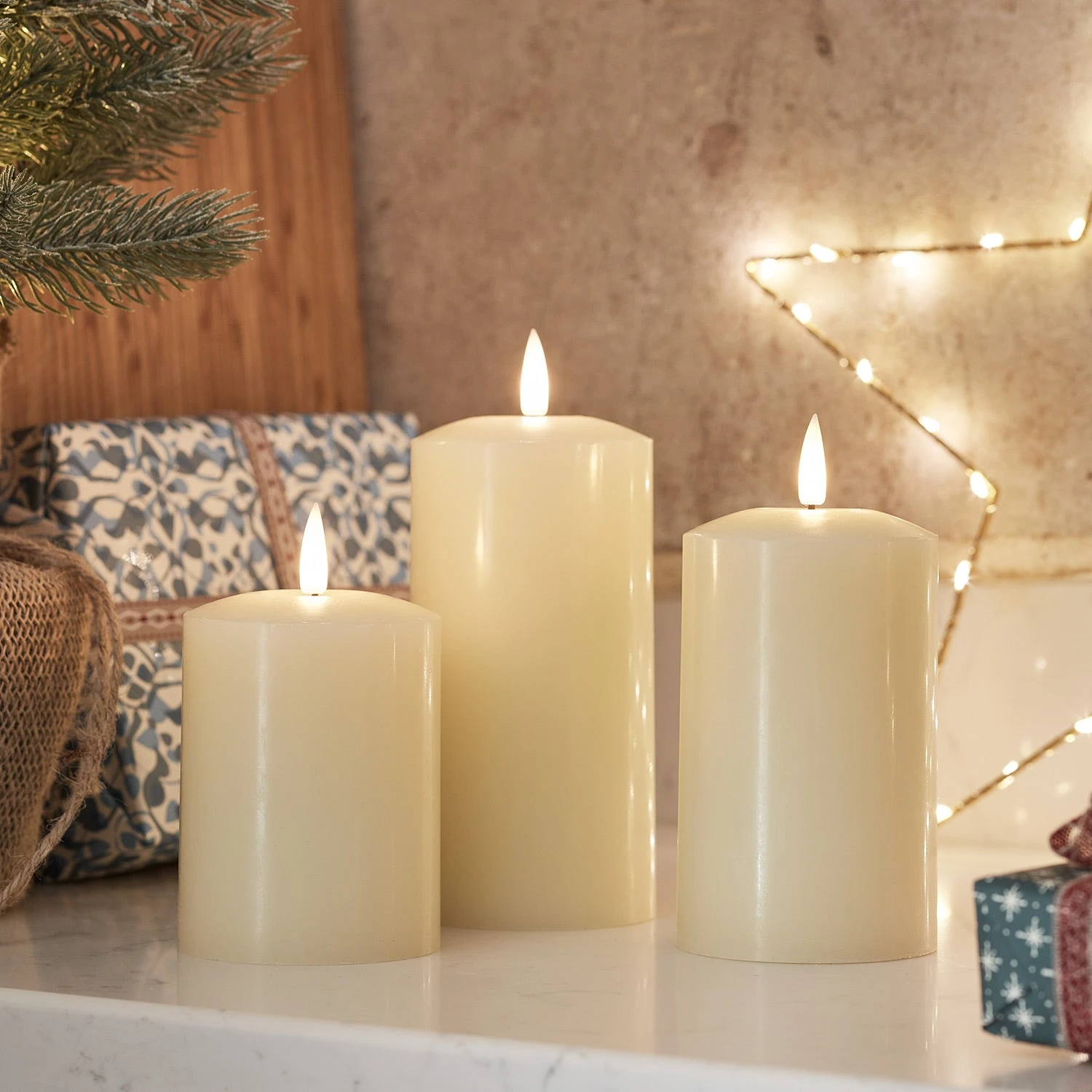 Durch das neue, verbesserte Design sind unsere TruGlow® Kerzen noch hochwertiger als zuvor: Sie bestehen nun zu einem größeren Anteil aus echtem Wachs und sehen dadurch nicht nur noch realistischer aus, sondern fühlen sich auch so an. Innovative Technologie ermöglicht das perfekte Nachahmen des Flackerns einer echten Flamme. Mit seinen variierenden Höhen (10 / 12,5 / 15cm) ist dieses Kerzen Trio eine stilvolle Ergänzung für jedes Zuhause. Platziere es auf deiner Fensterbank oder verwende es als Tischdekoration, um für eine gemütliche Atmosphäre zu sorgen.