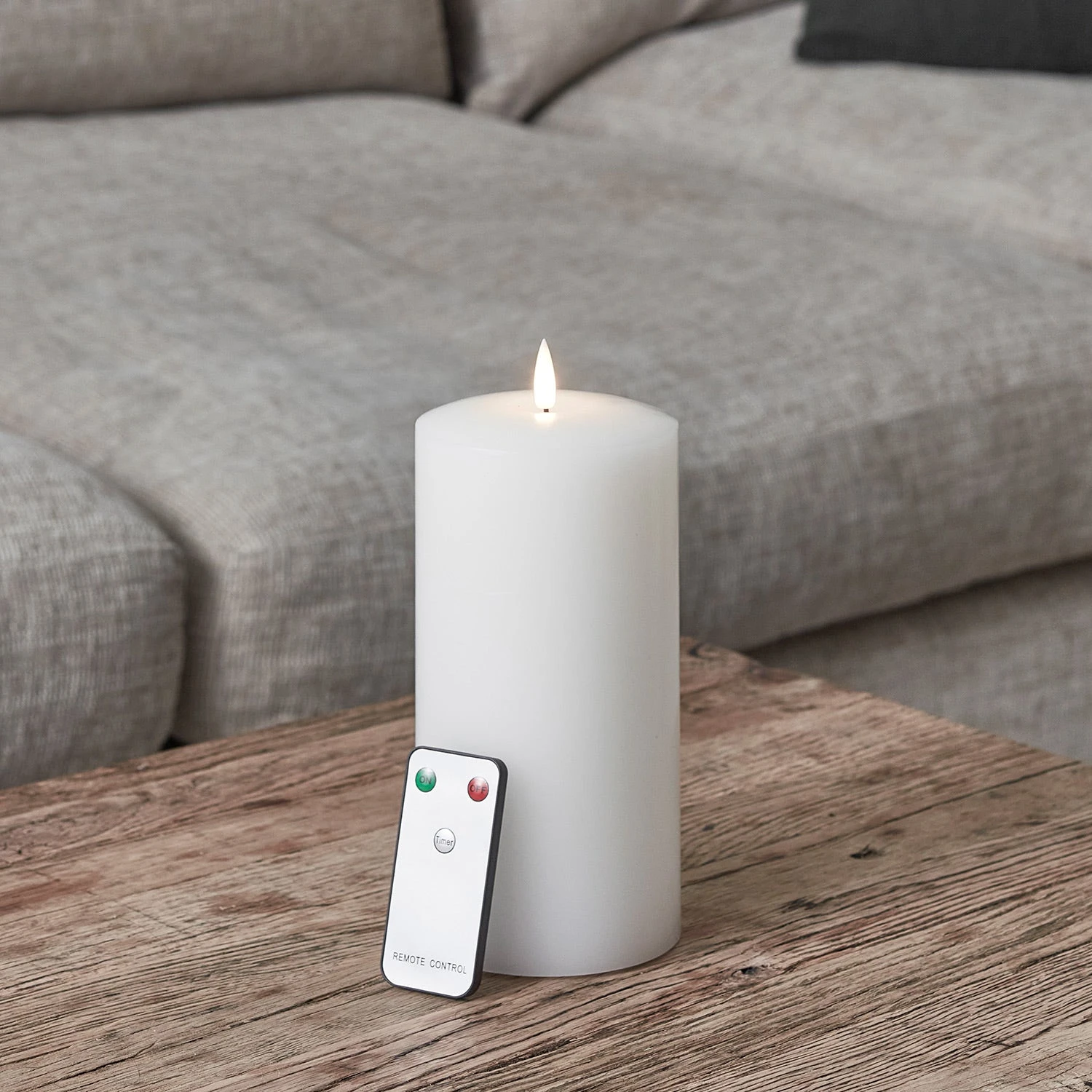 Unsere 20cm hohe breite LED Kerze in schlichtem Weiß schafft ein frisches und zugleich behagliches Ambiente in deinem Zuhause. Ganz gleich, ob allein oder in Kombination mit weiteren unserer LED Kerzen – sie verleiht deiner Dekoration einen eleganten Touch und sorgt für das gewisse Etwas! Bei unseren Kerzen aus der TruGlow® Serie wird handgegossenes Wachs mit innovativer Technologie kombiniert, um das Flackern echter Flammen perfekt zu imitieren. Dies ermöglicht auch, dass du die Kerze unbeaufsichtigt leuchten lassen kannst und sie problemlos mit deiner übrigen Deko in Berührung kommen kann. Lege einfach 2 x AA Batterien ein und verwende den praktischen 6-Stunden-Timer für ein automatisches Ein- und Ausschalten am Abend.
