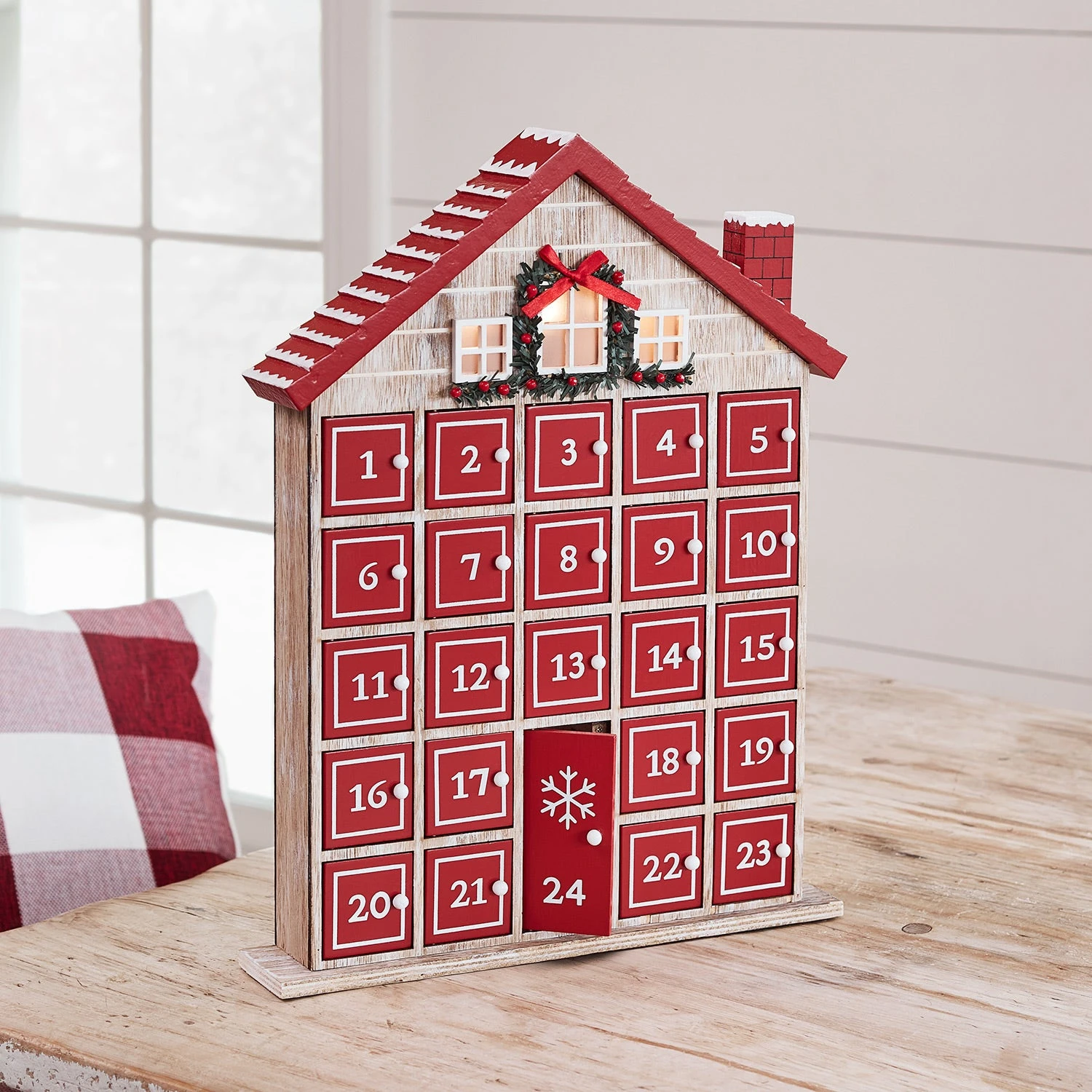 Mit diesem Adventskalender macht es besonders viel Spaß, die Tage bis Weihnachten zu zählen! Der aus Holz gefertigte Kalender im Bauernhaus-Stil hat eine Höhe von 43cm und versprüht ein nostalgisches Weihnachtsgefühl. Handbemalt in den Farben Rot und Weiß könnte diese Adventsdekoration nicht traditioneller sein. Durch die Fenster schimmert das sanfte Licht von 3 warmweißen LEDs und sorgt besonders am Abend für ein wohliges Leuchten. Fülle jedes Türchen mit einer liebevollen Botschaft oder einer köstlichen Leckerei – etwa um dir selbst eine Freude zu bereiten oder, um deiner Lieblingsperson täglich ein Lächeln ins Gesicht zu zaubern. Lege einfach 2 x AA Batterien in das Batteriefach ein, um den Adventskalender zum Leben zu erwecken.